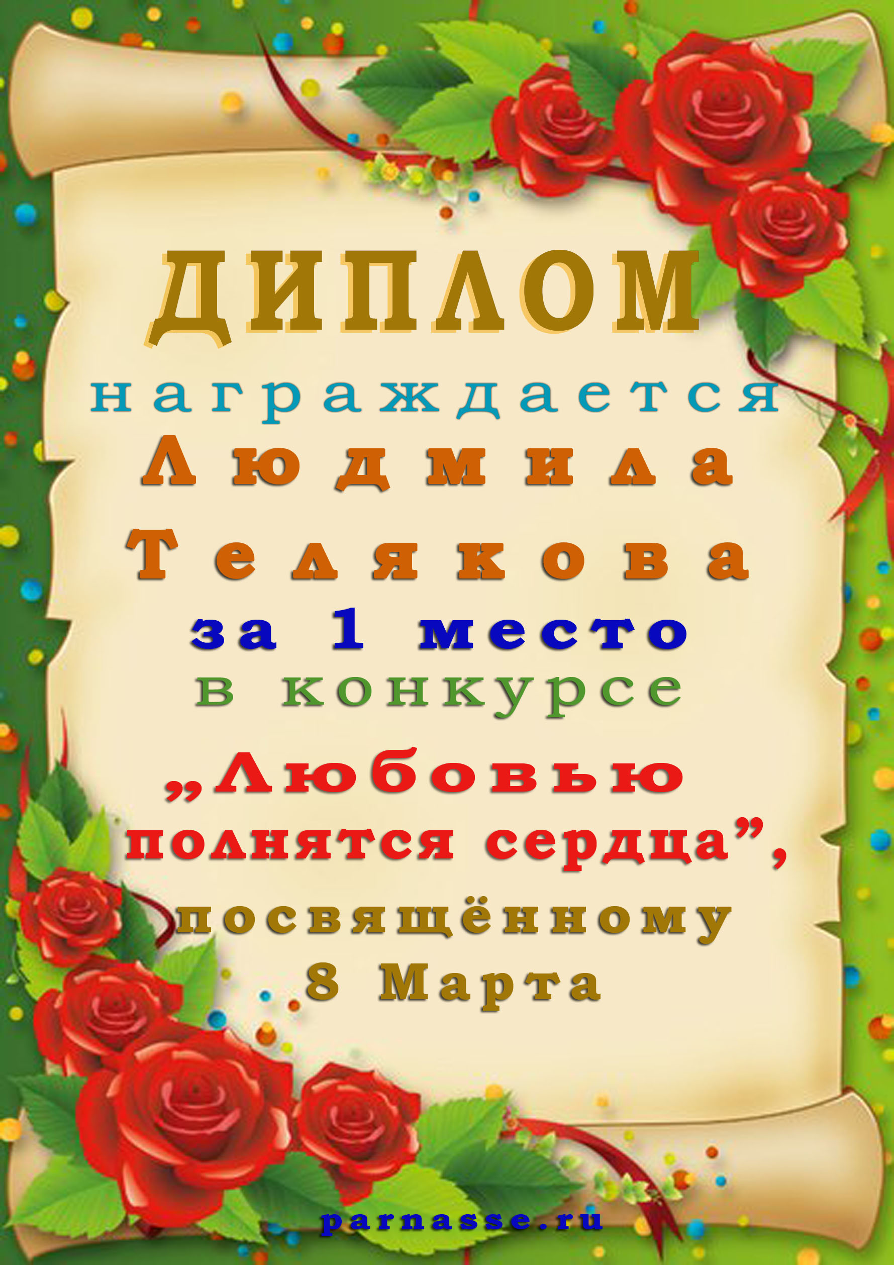 За 1 место в Конкурсе "Любовью полнятся сердца", посвящённого 8 Марта