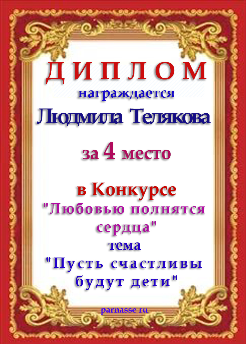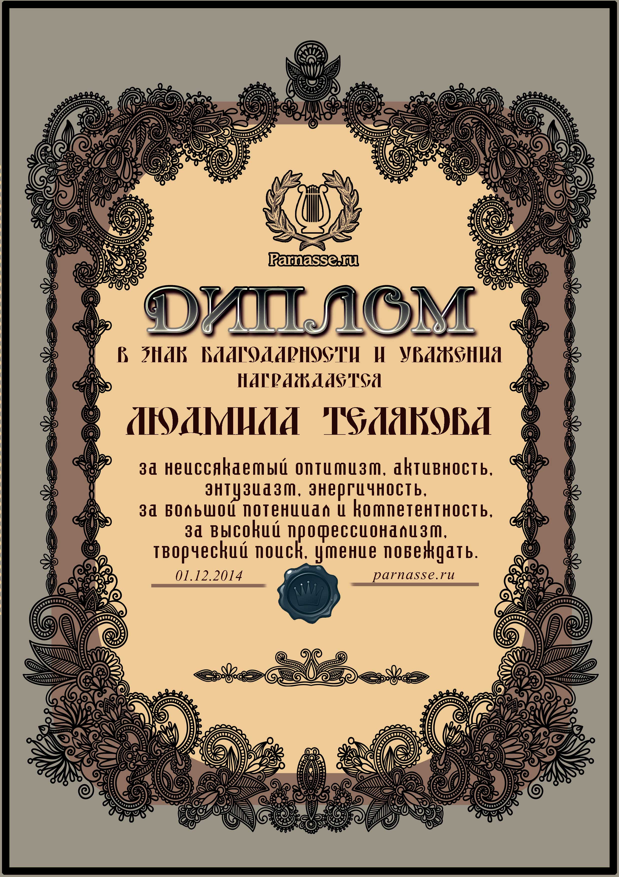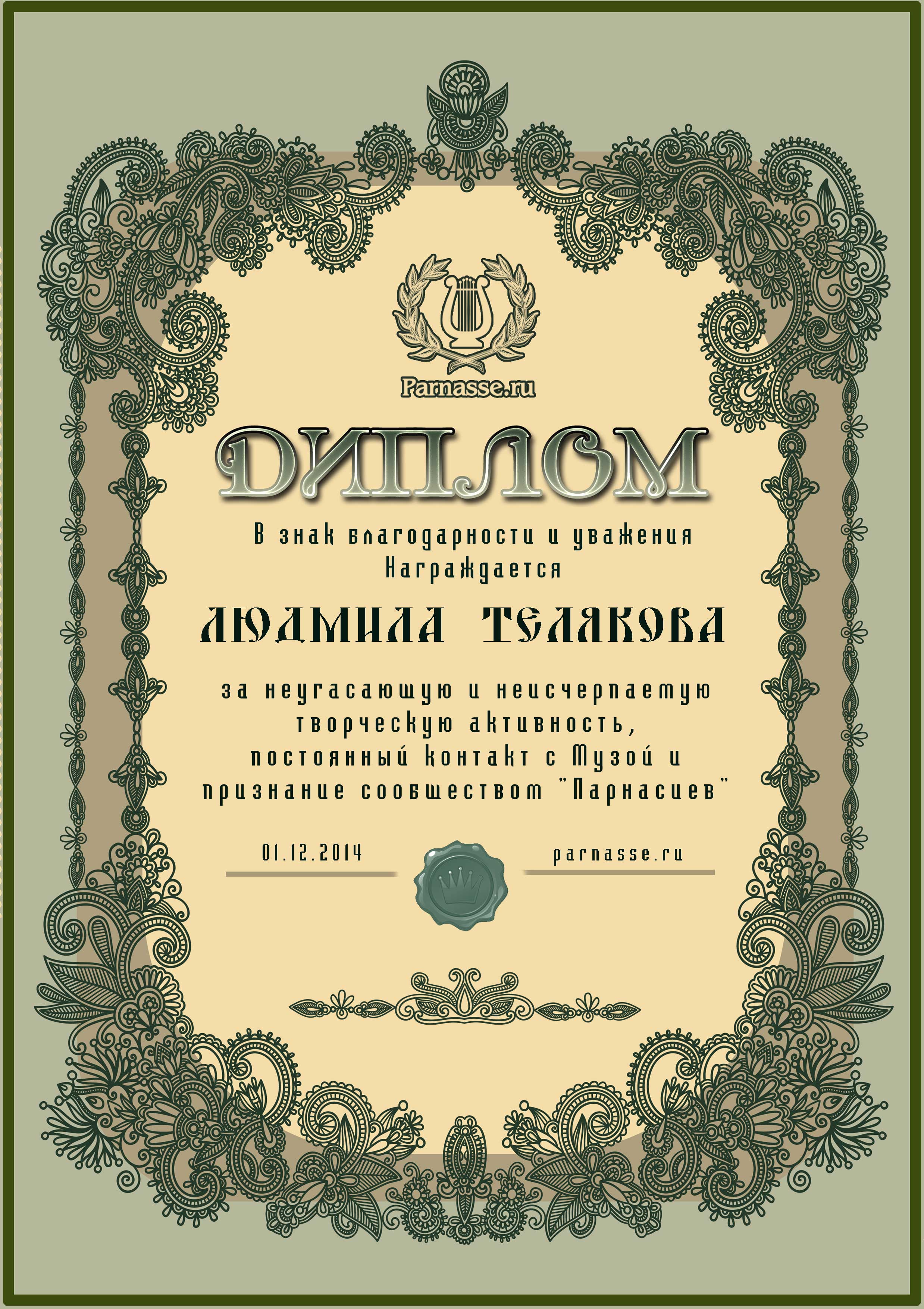 За неугасающую и неисчерпаемую творческую активность, постоянный контакт с Музой и признание сообществом "Парнасцев".От всей души желаем Вам, Людмила, здоровья, любви, успехов, благополучия, удачи и творческого вдохновения!