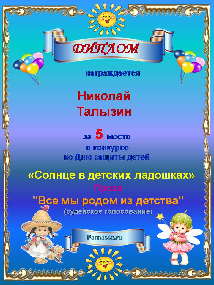 За пятое место в конкурсе, посвященном Дню защиты детей. Судейское голосование. Прозаическая Номинация "Все мы родом из детства". Произведение "Рассказывайте детям сказки, пожалуйста!". Поздравляем с победой.