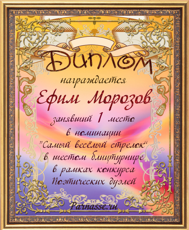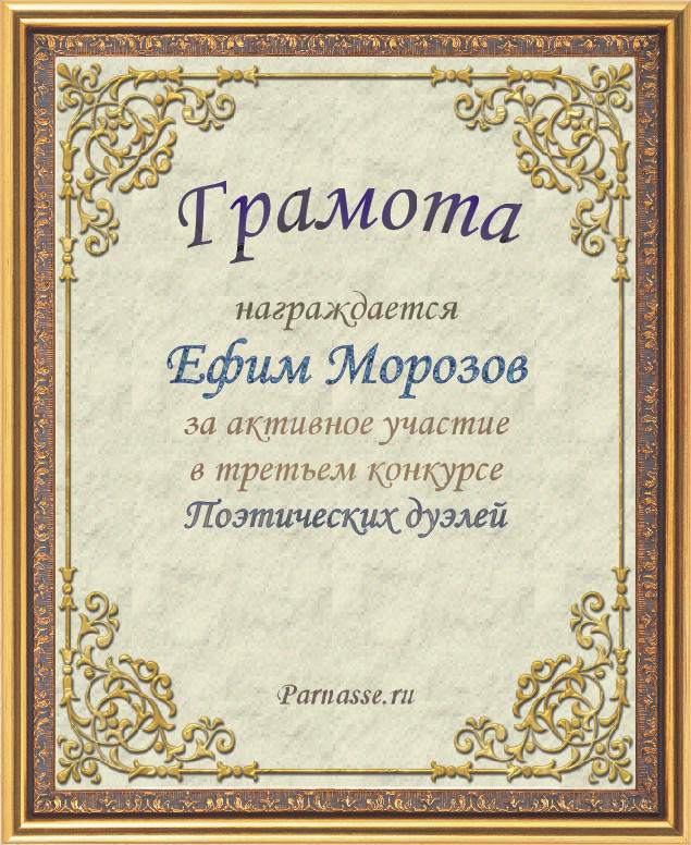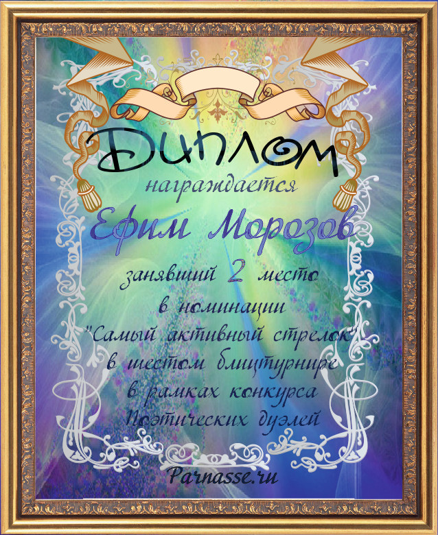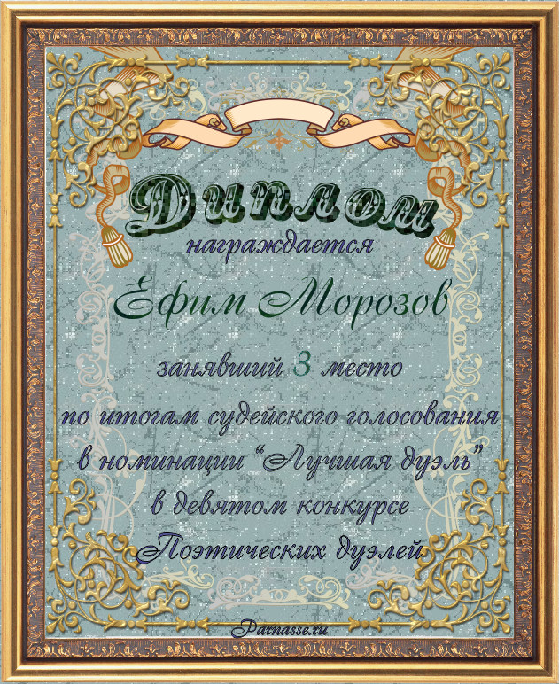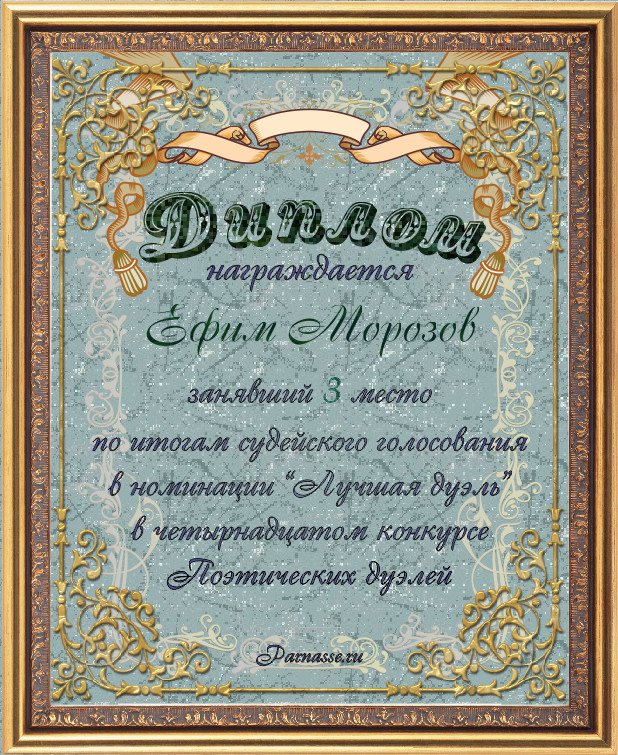 Диплом за 3-е место в номинации "Лучшая дуэль" по итогам судейского голосования в девятом конкурсе поэтических дуэлей(№ 8.2)