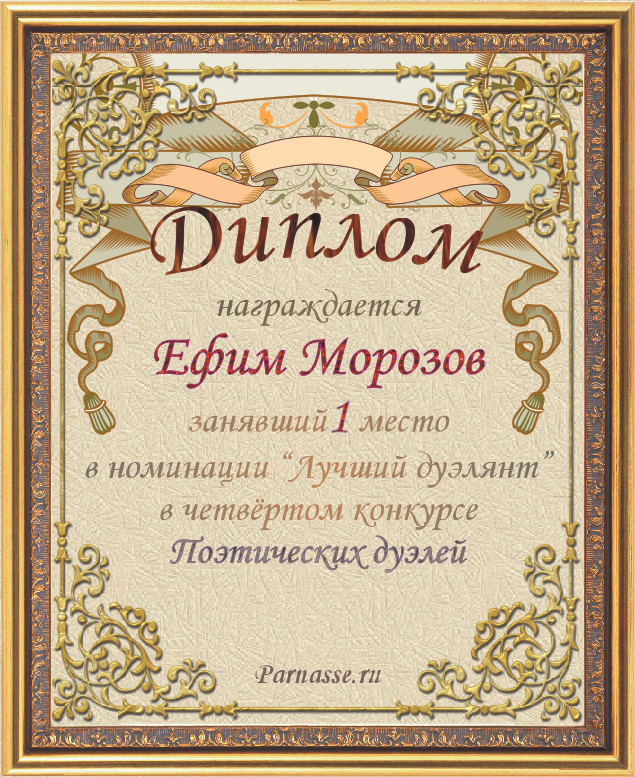 Диплом за победу в номинации "Лучший дуэлянт" в четвёртом конкурсе Поэтических дуэлей