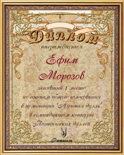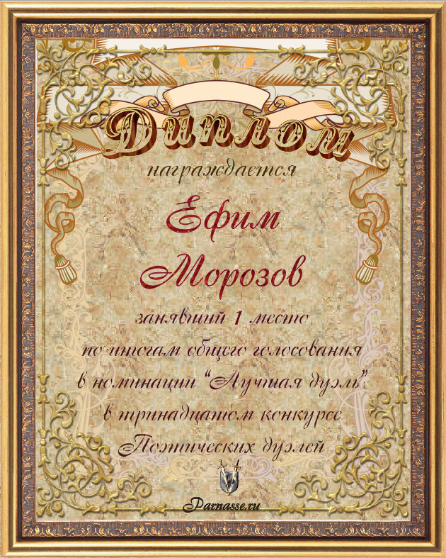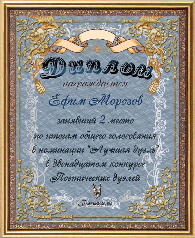 Диплом за 3-е место в номинации "Лучшая дуэль" по итогам общего голосования в девятом конкурсе поэтических дуэлей(№ 13.3)