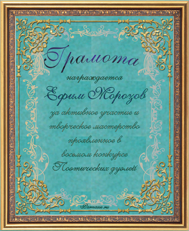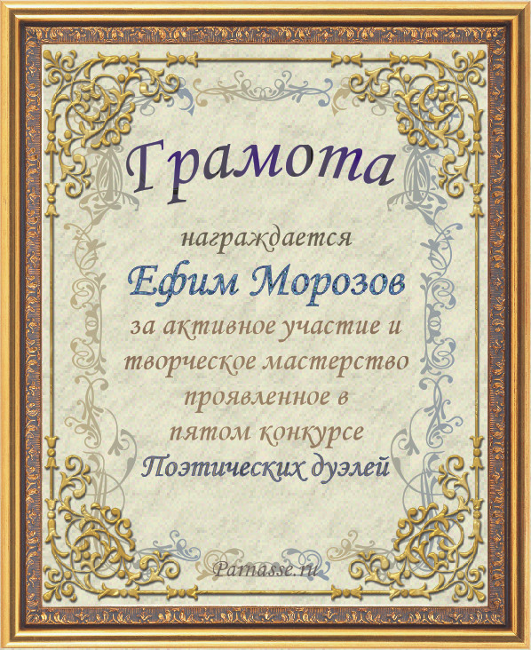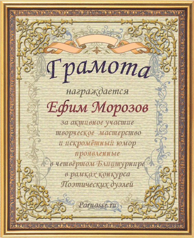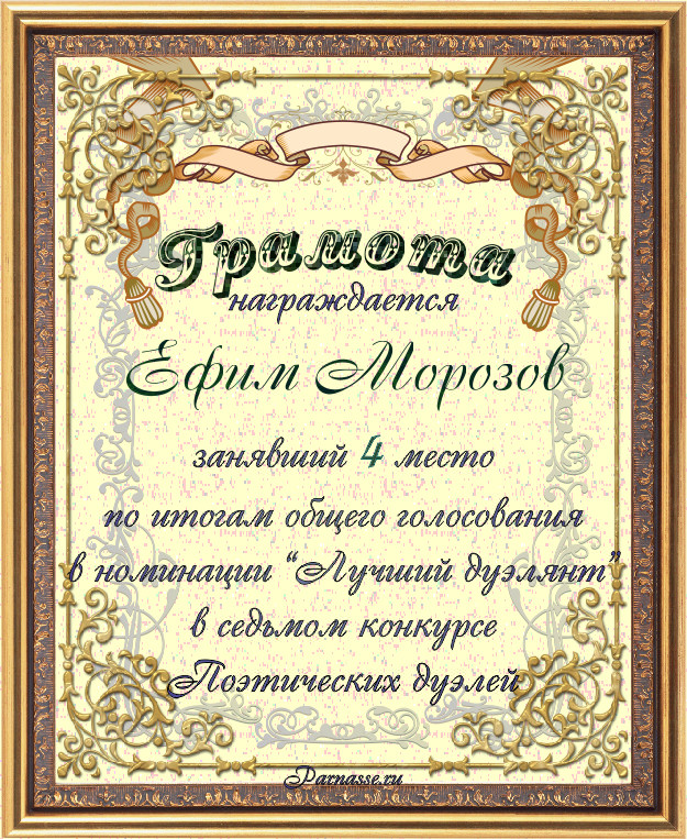 Грамота за 4-е место в номинации "Лучший дуэлянт" по итогам общего голосования в седьмом конкурсе поэтических дуэлей