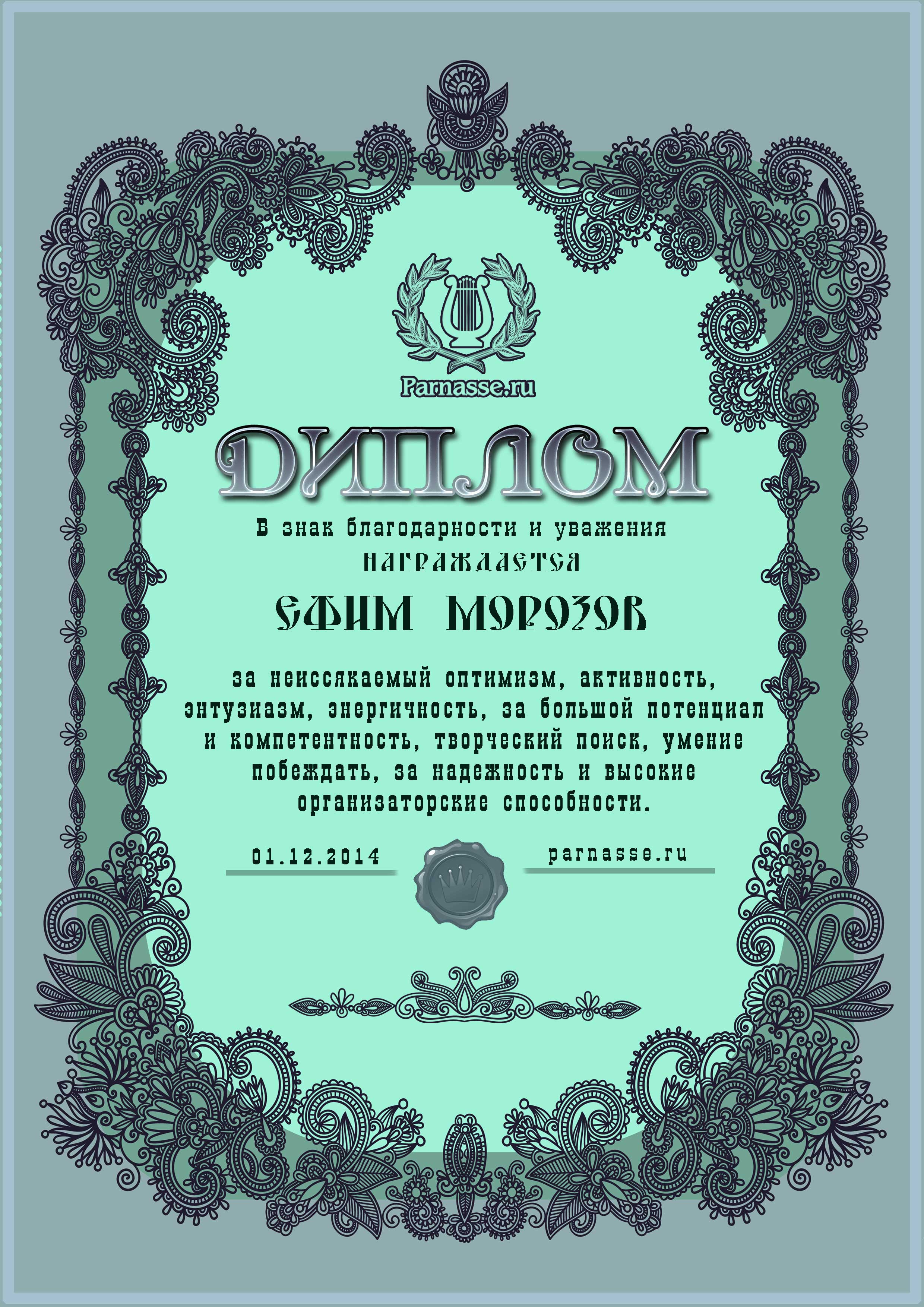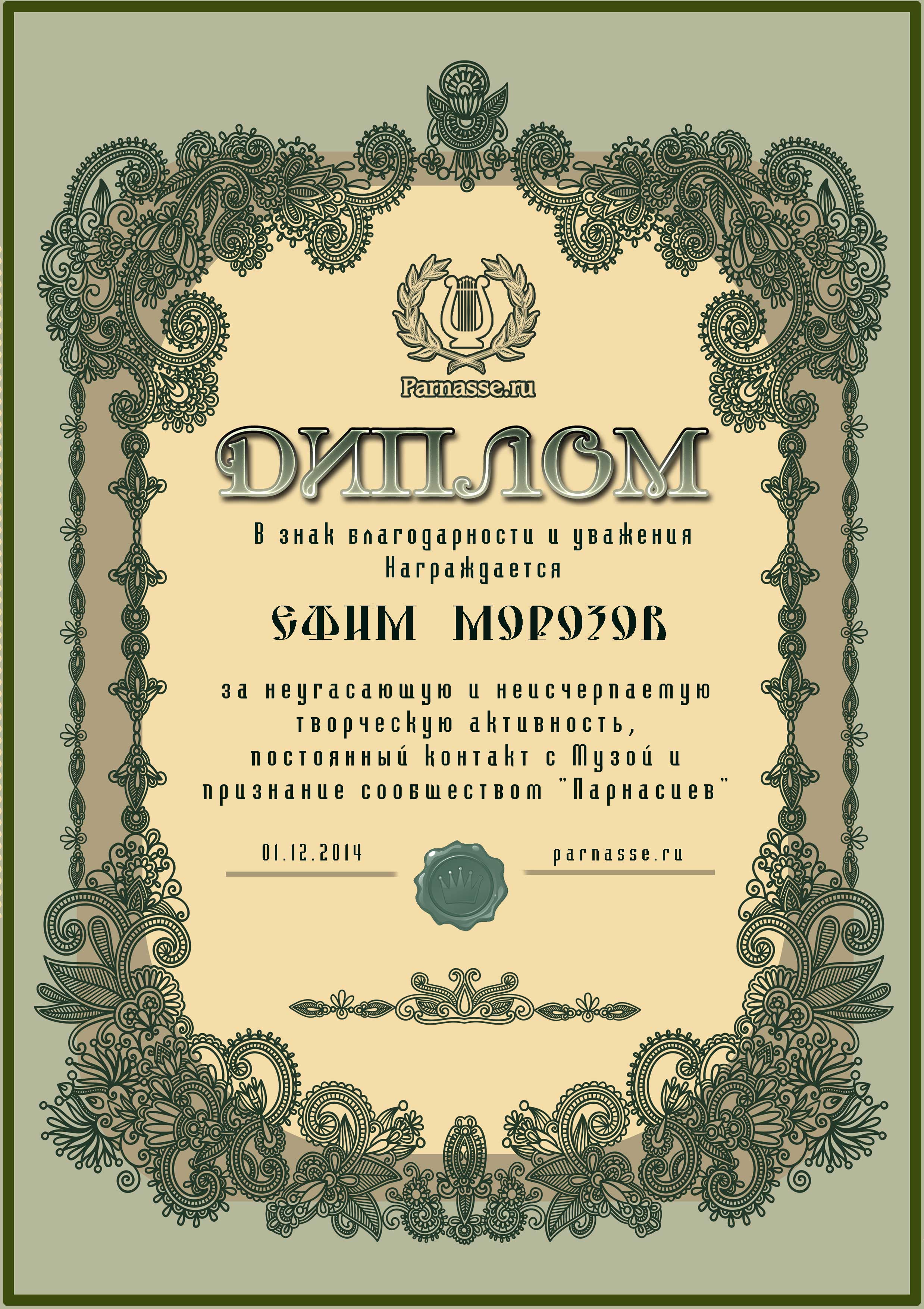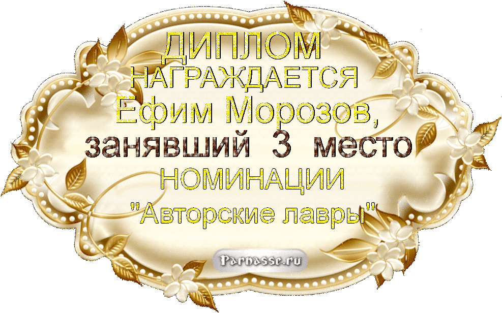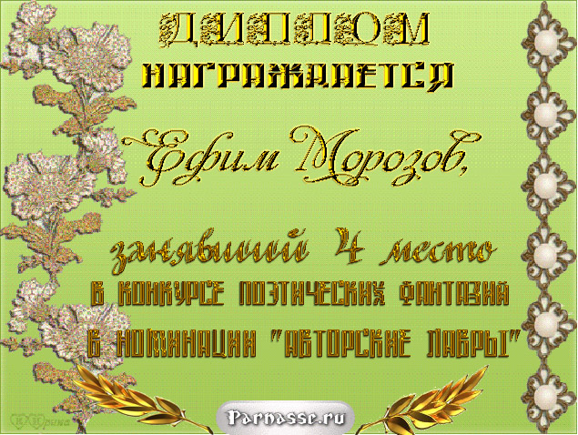 За неугасающую и неисчерпаемую творческую активность, постоянный контакт с Музой и признание сообществом "Парнасцев".От всей души желаем Вам, Ефим, здоровья, любви, успехов, благополучия, удачи и творческого вдохновения!