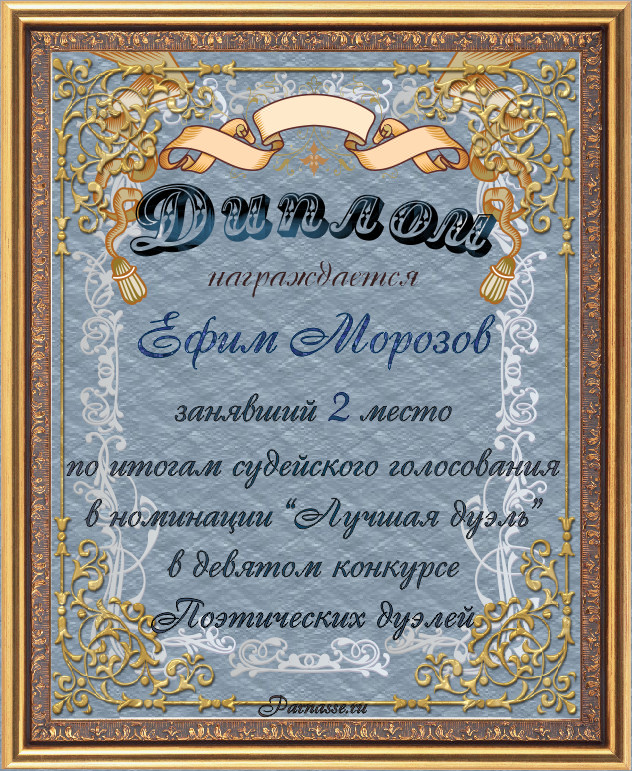 Диплом за 2-е место в номинации "Лучшая дуэль" по итогам судейского голосования в девятом конкурсе поэтических дуэлей(№ 16.2)