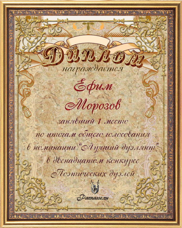 Диплом за 1-е место в номинации "ЛУЧШИЙ ДУЭЛЯНТ" по итогам общего голосования в 12М конкурсе поэтических дуэлей