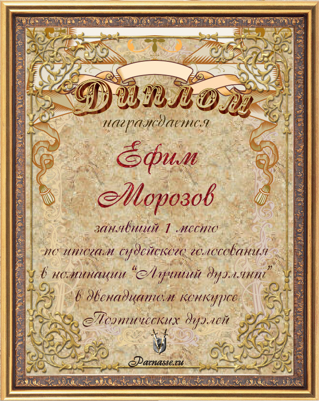 Диплом за 1-е место в номинации "ЛУЧШИЙ ДУЭЛЯНТ" по итогам судейского голосования в 12М конкурсе поэтических дуэлей