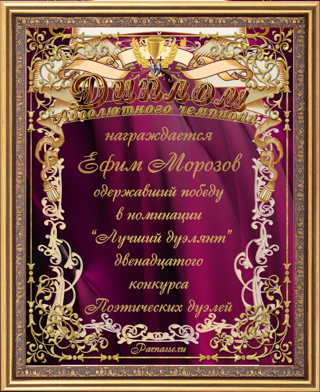 ДИПЛОМ ЧЕМПИОНА ДВЕНАДЦАТОГО КОНКУРСА ПОЭТИЧЕСКИХ ДУЭЛЕЙ В НОМИНАЦИИ "ЛУЧШИЙ ДУЭЛЯНТ"