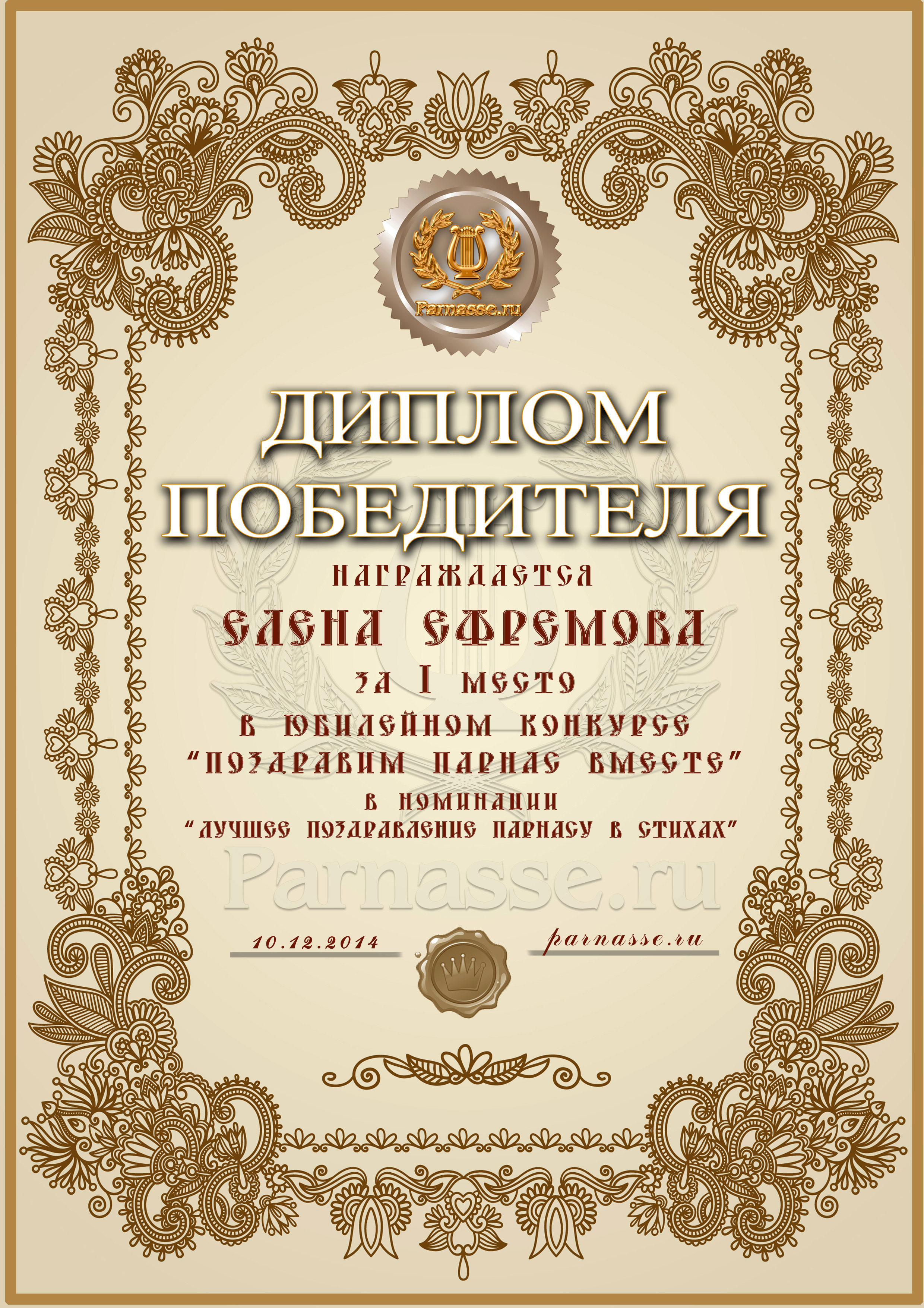 Диплом за 1 место в праздничном конкурсе "Поздравим Парнас с трёхлетием вместе!"