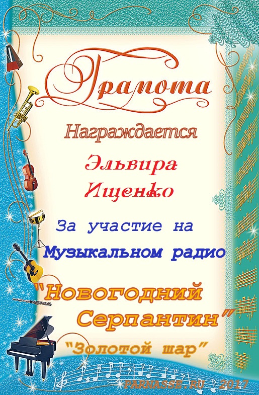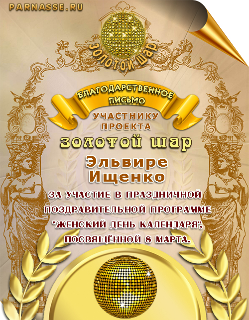 Похвальная Грамота за участие в Новогодних праздничных мероприятиях на проекте "ЗОЛОТОЙ ШАР"!Поздравляем!