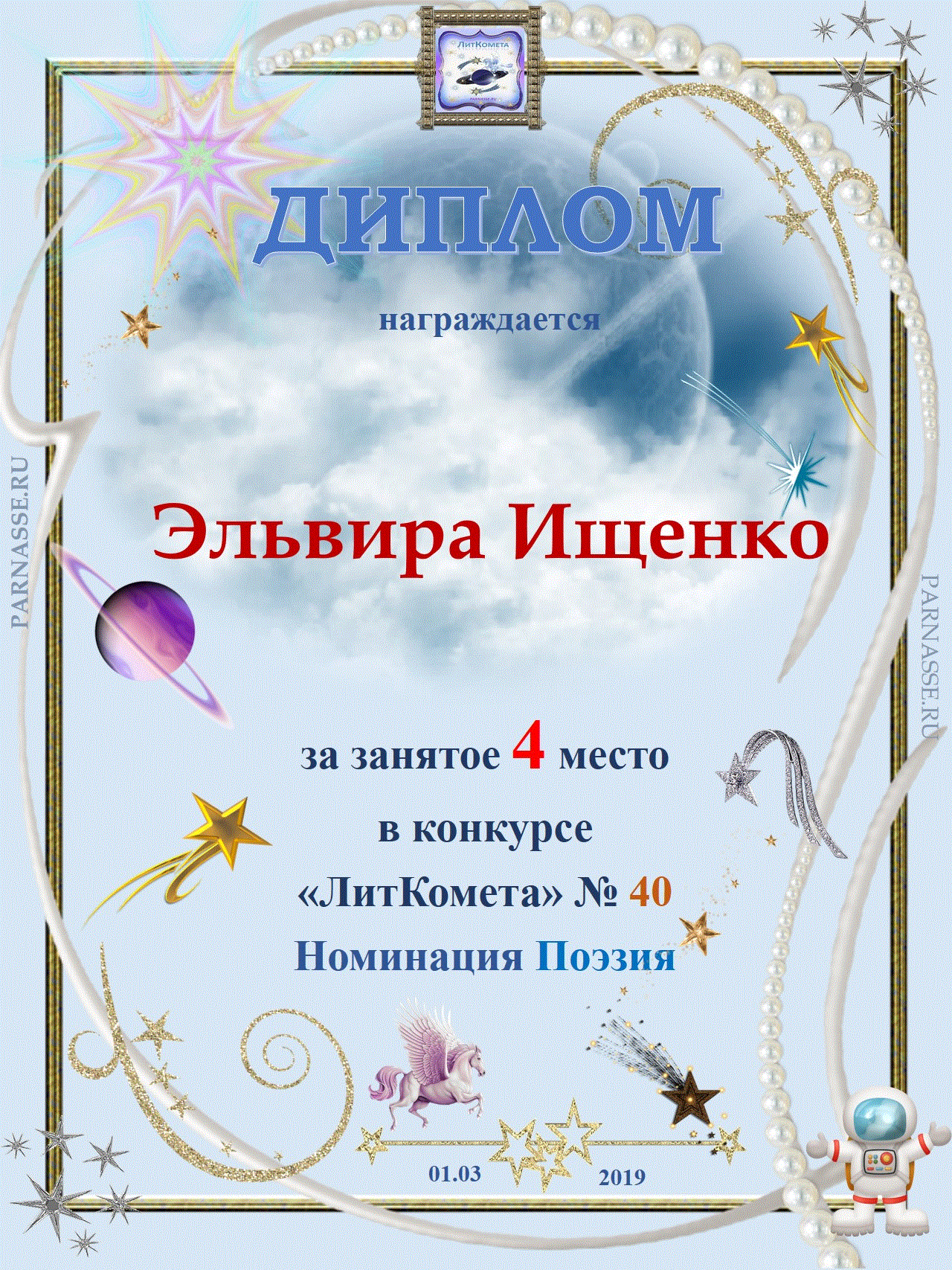 Поздравляю с занятым 4 местом в конкурсе "Литературная Комета - Полёт № 59" Номинации Поэзия!