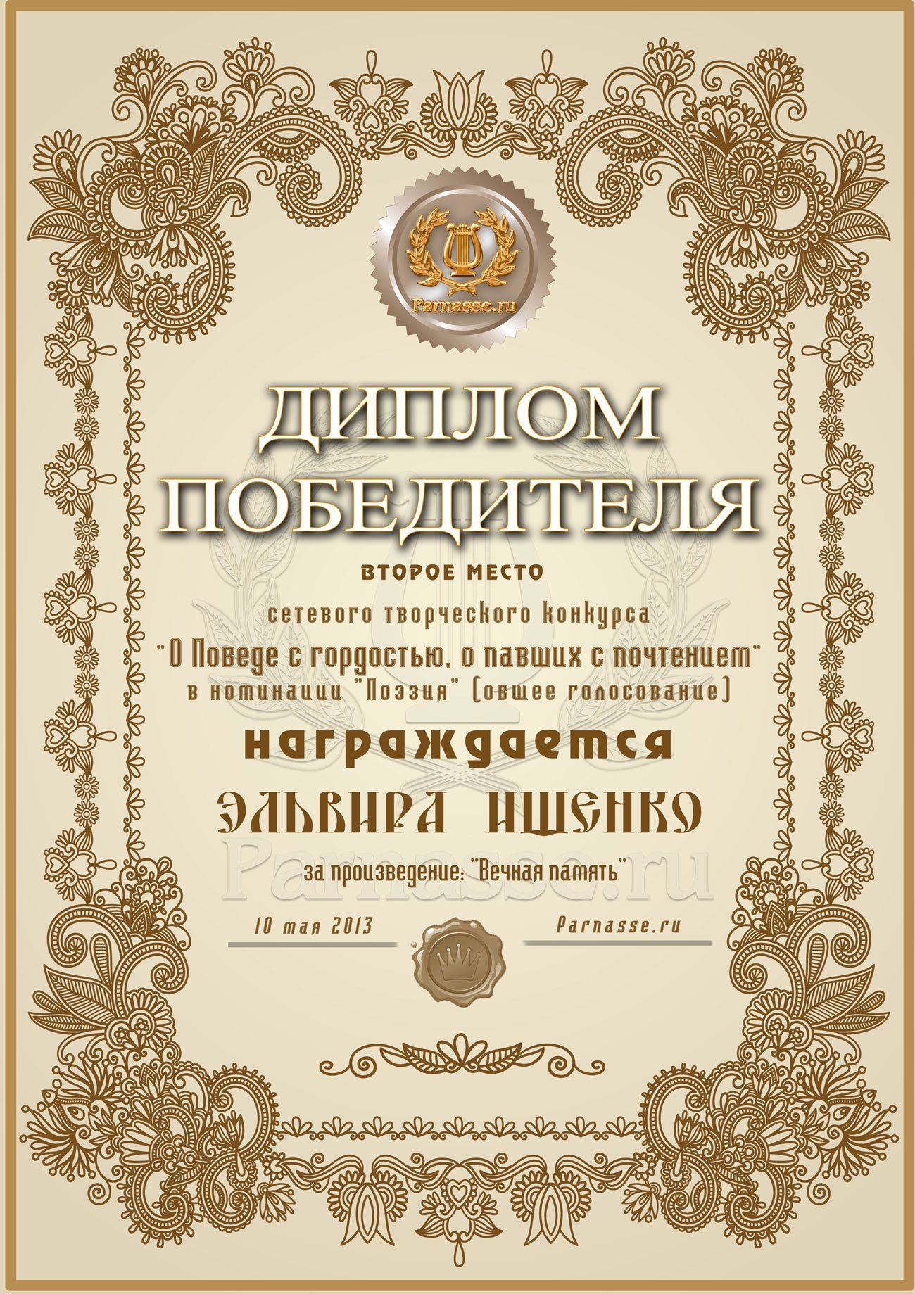 Первое место по решению Администрации и Главного судьи конкурса "Навечно в памяти"