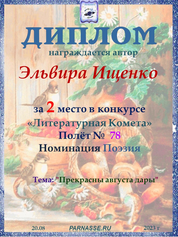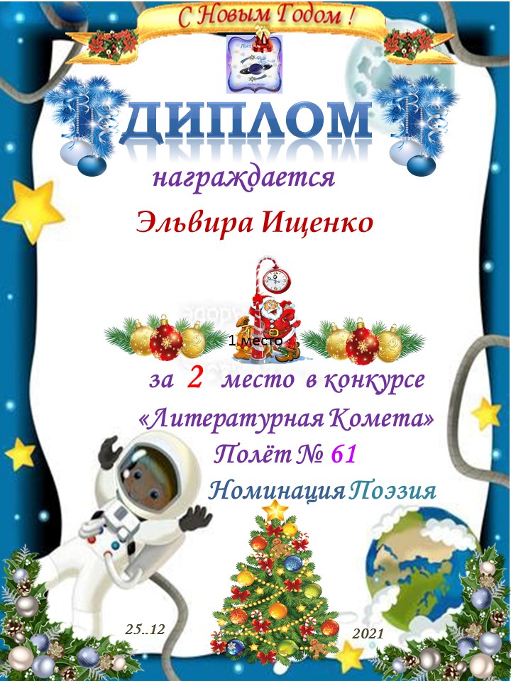 Поздравляю с занятым 2 местом в конкурсе "Литературная Комета - Полёт № 61" в Номинации Поэзия!
