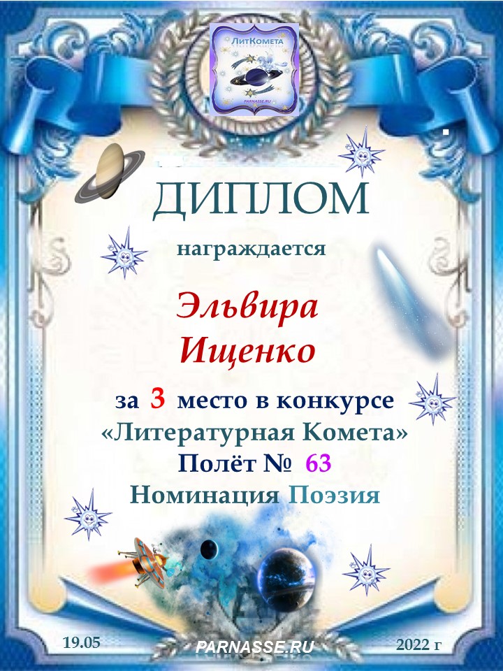 Поздравляю с занятым 3 местом в конкурсе "ЛитКомета-Полёт № 64" в Номинации Поэзия!