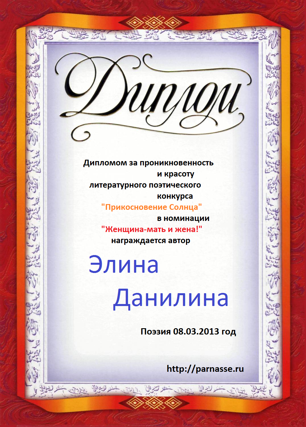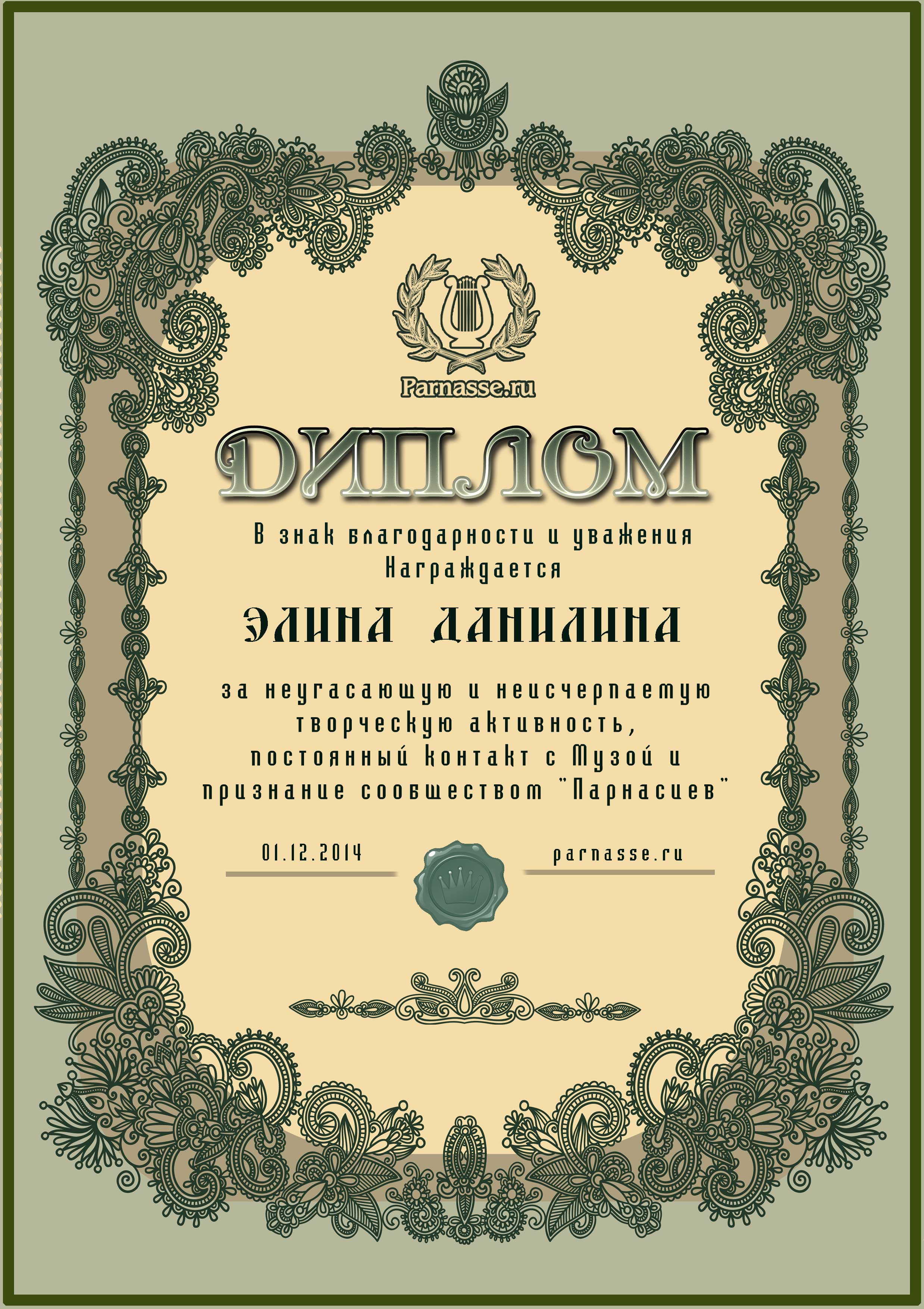 За неугасающую и неисчерпаемую творческую активность, постоянный контакт с Музой и признание сообществом "Парнасцев".От всей души желаем Вам, Элина, здоровья, любви, успехов, благополучия, удачи и творческого вдохновения!