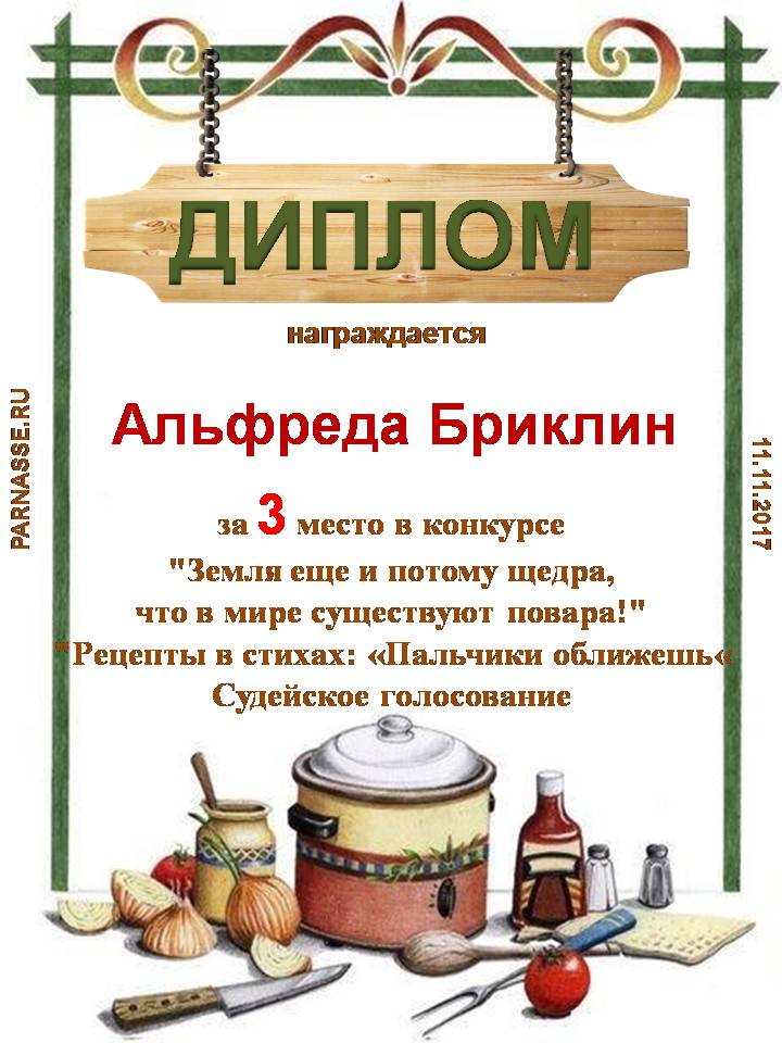 Поздравляем с 3 местом! Номинация: Рецепты в стихах:Пальчики оближешь! - судейское голосование.