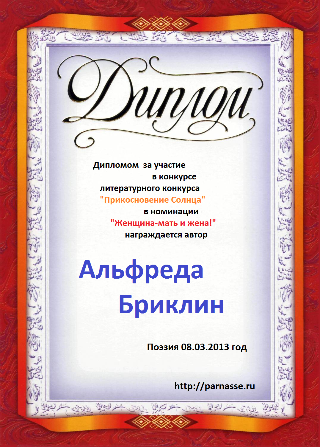 Диплом в конкурсе поэзии "Прикосновение Солнца"