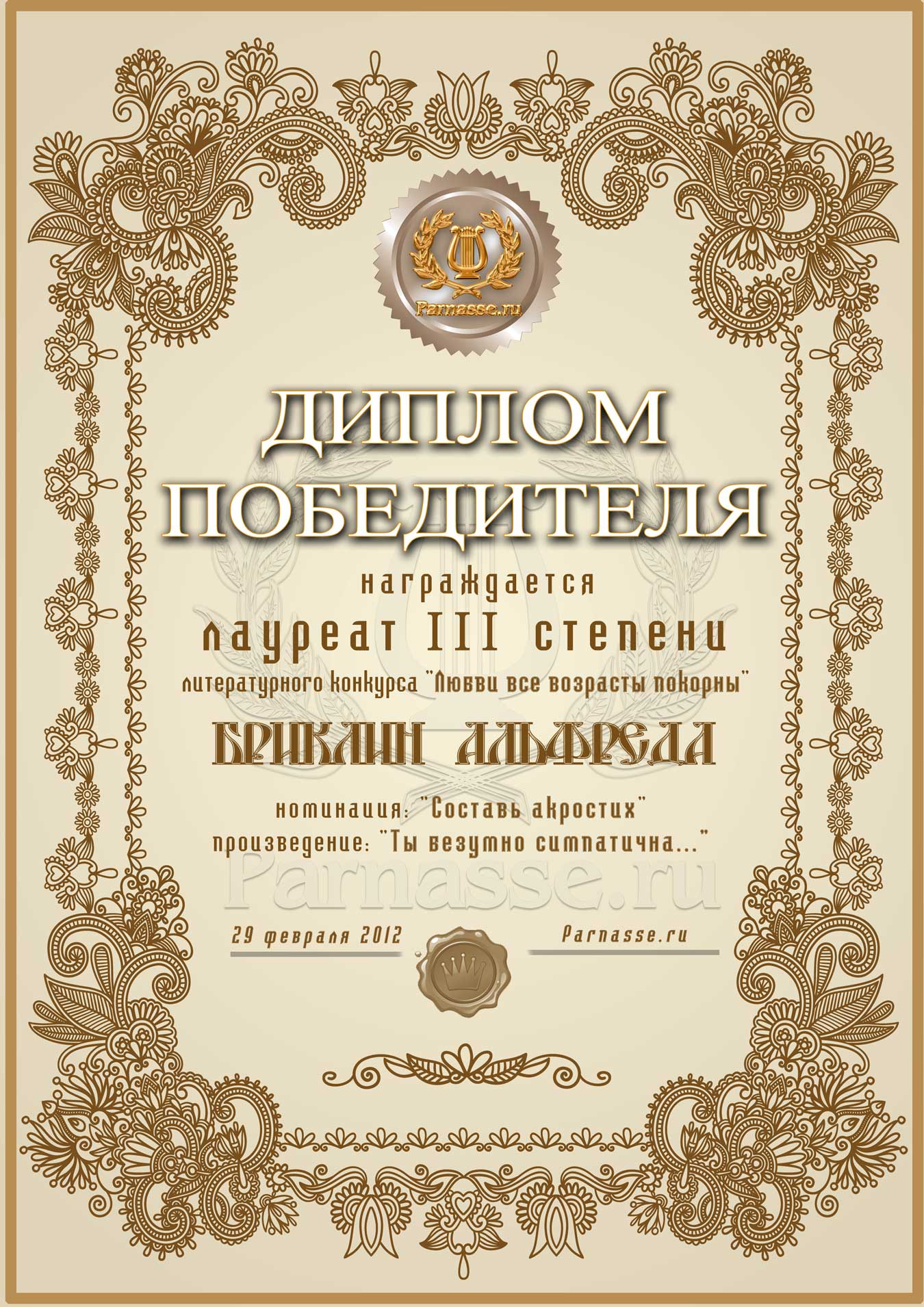Диплом лауреата III степени лит.конкурса "Любви все возрасты покорны"