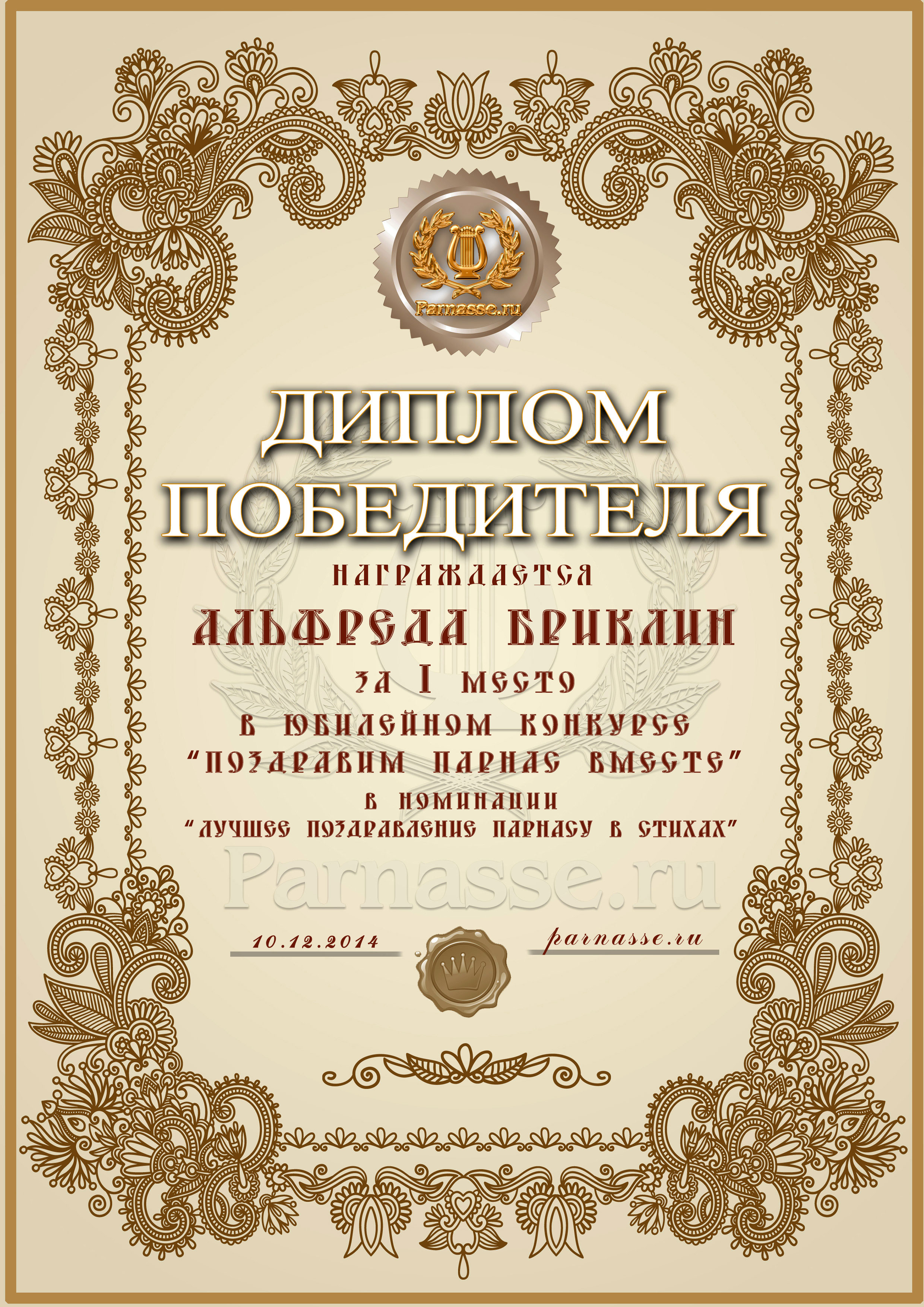 ![]() Золотой Кубок "Гордость Парнаса!"