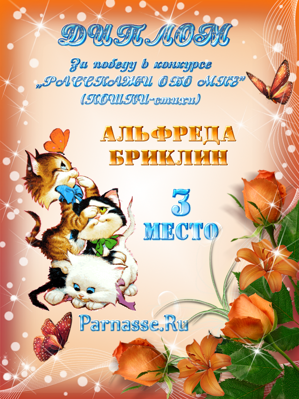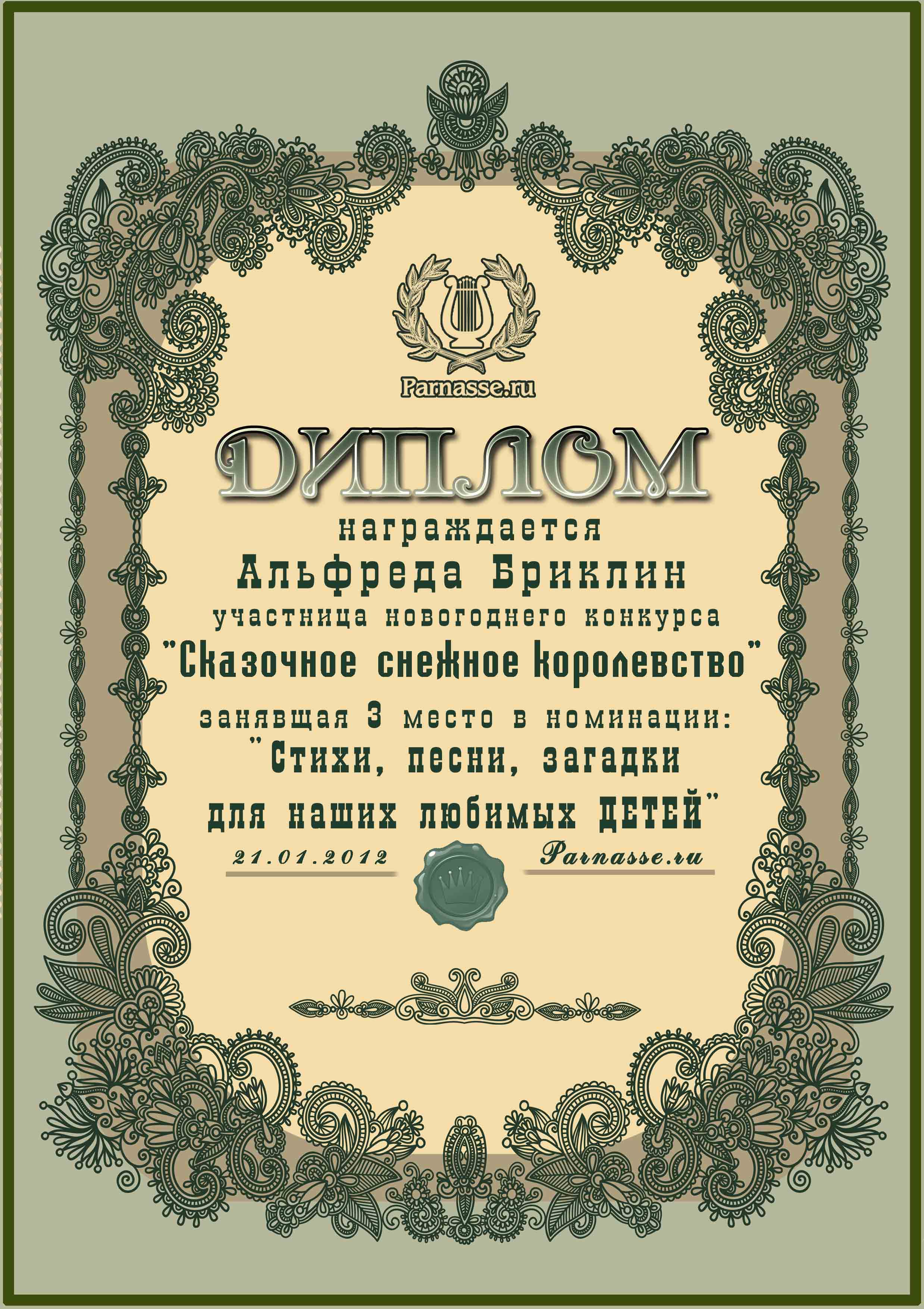 За 11 конкурсных прекрасных произведений для детей в конкурсе "ЗИМНЯЯ СКАЗКА" в номинации "За оригинальность и супер отличное раскрытие темы конкурса, за поэтическую изысканность и виртуозность, за литературно-детское мастерство и высокий профессионализм!" Поздравляем с блестящей победой в конкурсе, Альфреда!