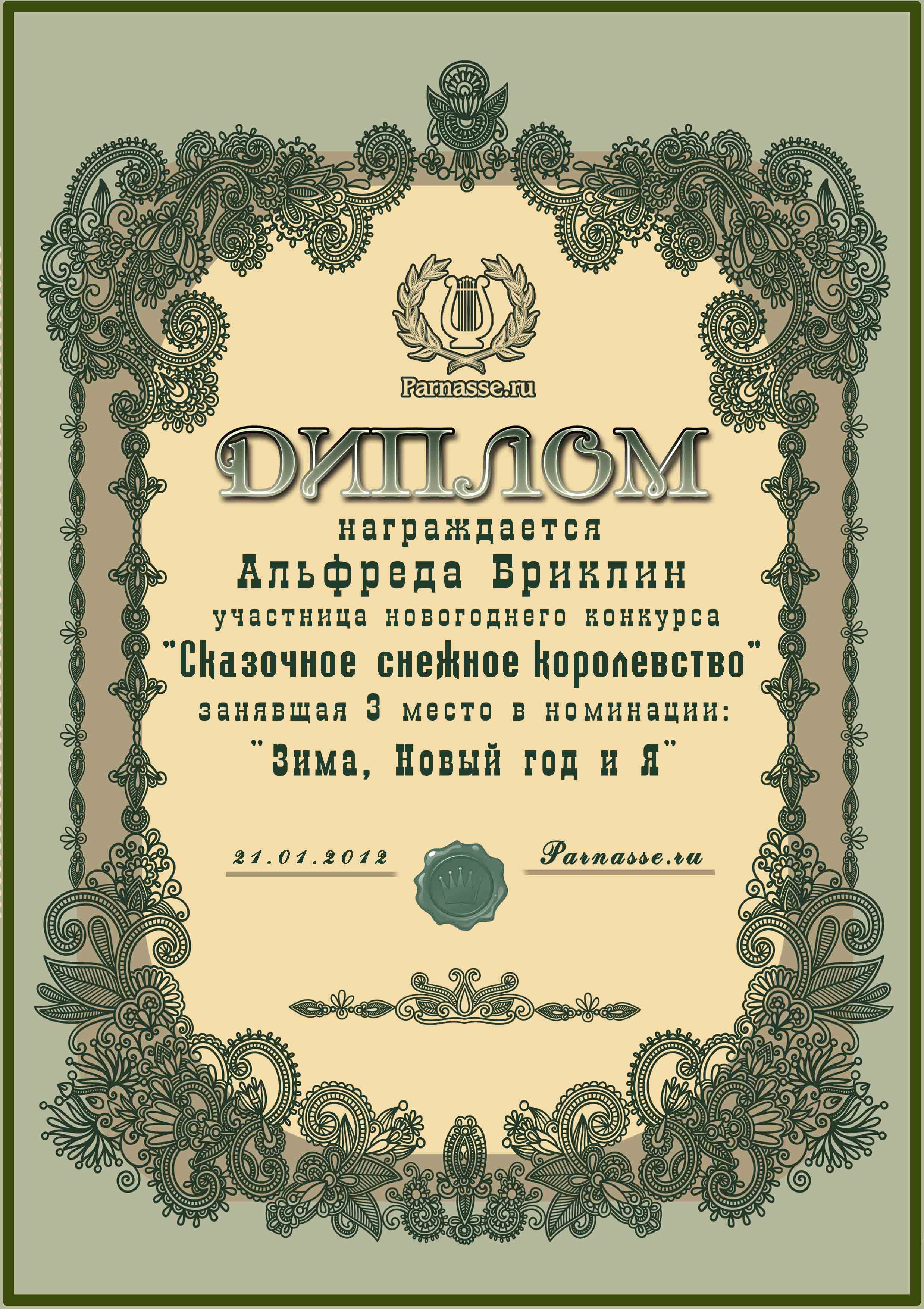 Диплом за 3 место в конкурсе "Литературный снегопад".