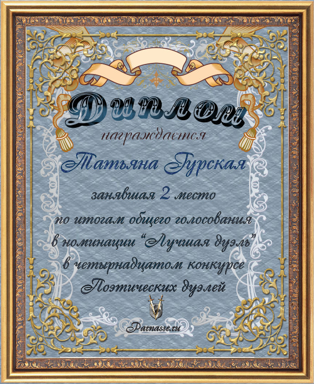 Диплом за 2-е место в номинации "ЛУЧШАЯ ДУЭЛЬ" по итогам общего голосования в 14ом конкурсе поэтических дуэлей (№ 8.3)