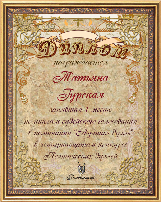 Диплом за 1-е место в номинации "ЛУЧШАЯ ДУЭЛЬ" по итогам общего голосования в 14ом конкурсе поэтических дуэлей (№ 8.2)