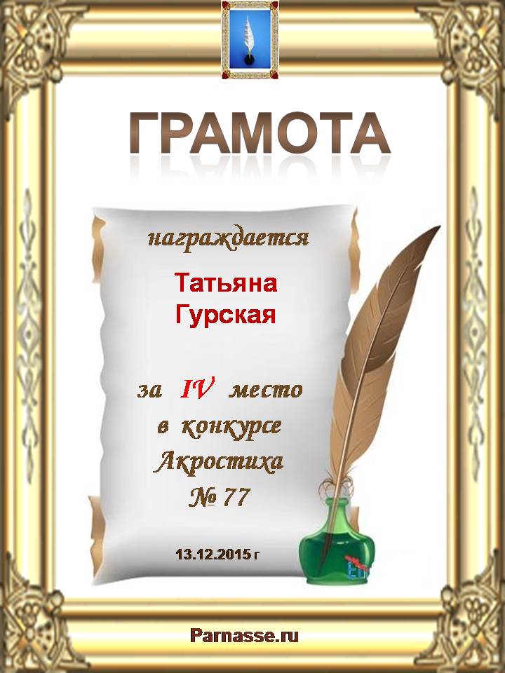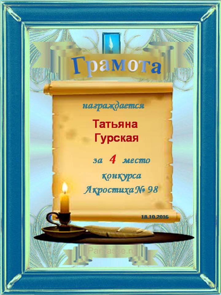 Грамота за 4 место в 98 конкурсе АКРОСТИХА (Альтернатива)! ПОЗДРАВЛЯЮ!