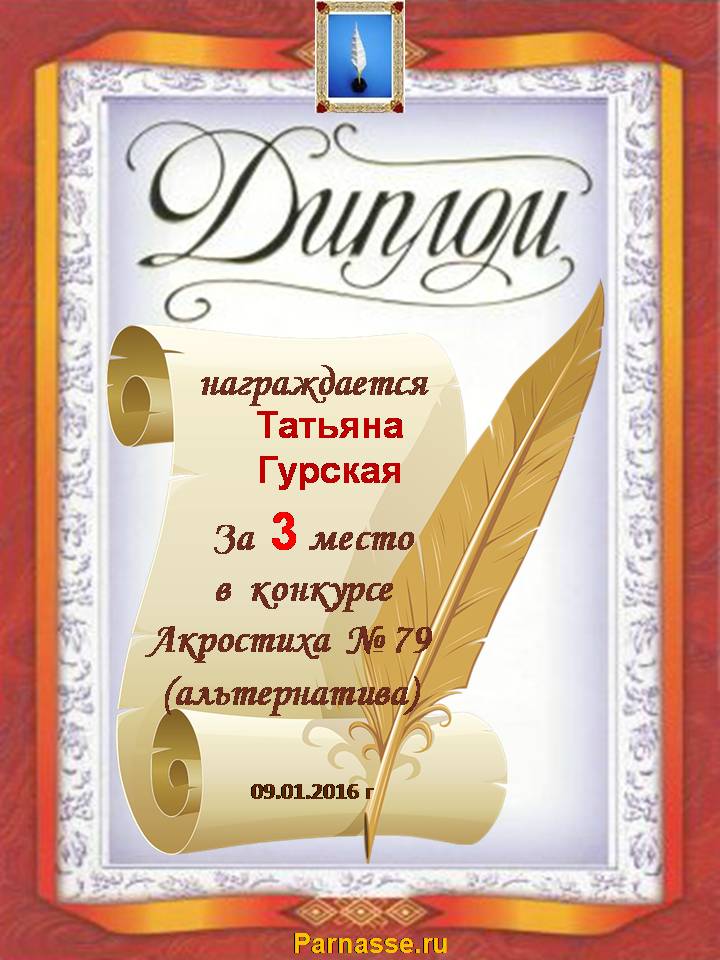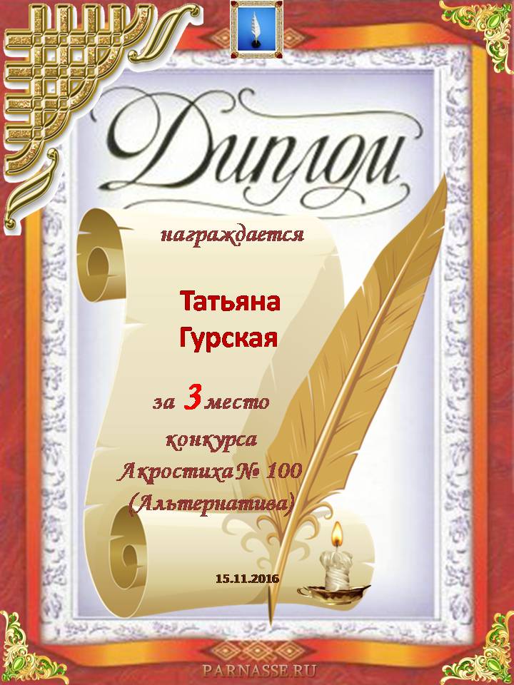 Диплом за 3 место в юбилейном конкурсе АКРОСТИХА № 100 (Альтернатива)! ПОЗДРАВЛЯЮ!
