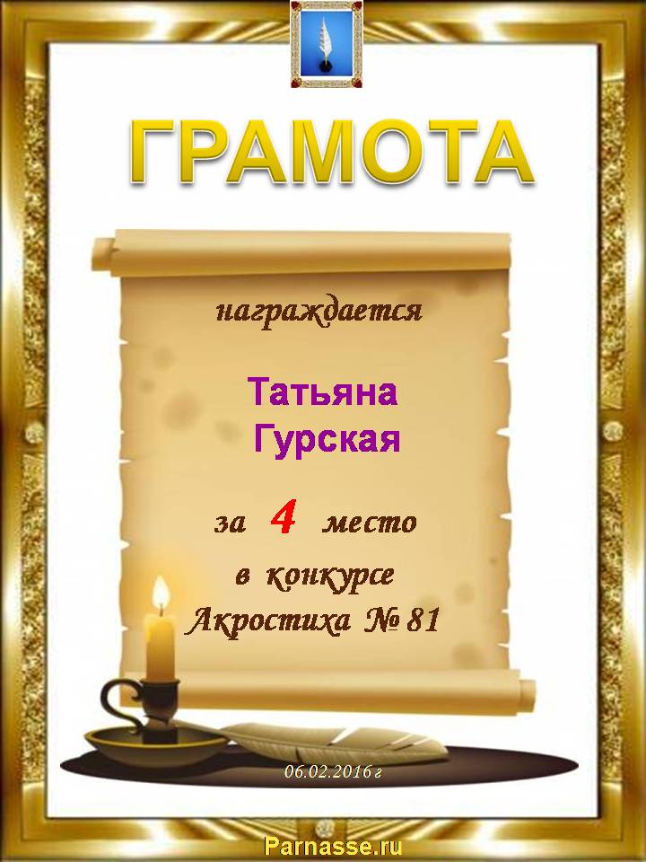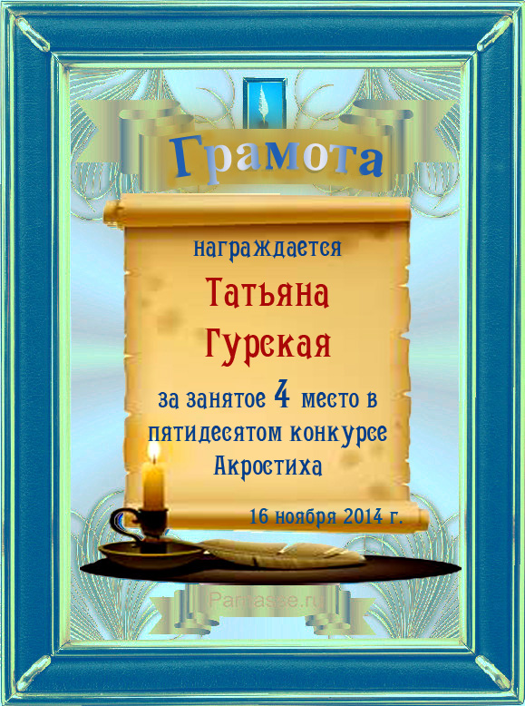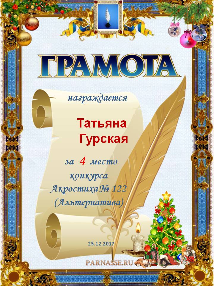 Грамота за 4 место в 122 конкурсе АКРОСТИХА (Альтернатива)! ПОЗДРАВЛЯЮ!