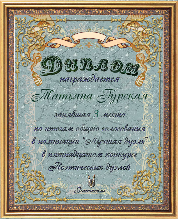 Диплом за 3-е место в номинации "Лучшая дуэль" по итогам общего голосования в одиннадцатом конкурсе поэтических дуэлей (№ 6.2)