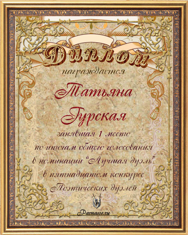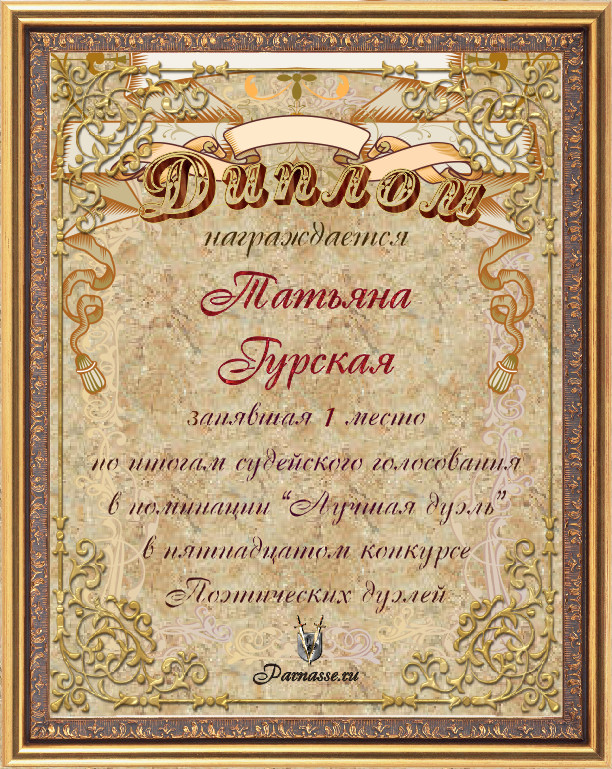 Диплом за 1-е место в номинации "ЛУЧШАЯ ДУЭЛЬ" по итогам общего голосования в 15ом конкурсе поэтических дуэлей (№ 10.1)