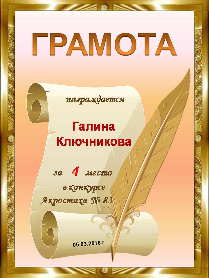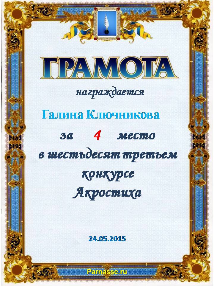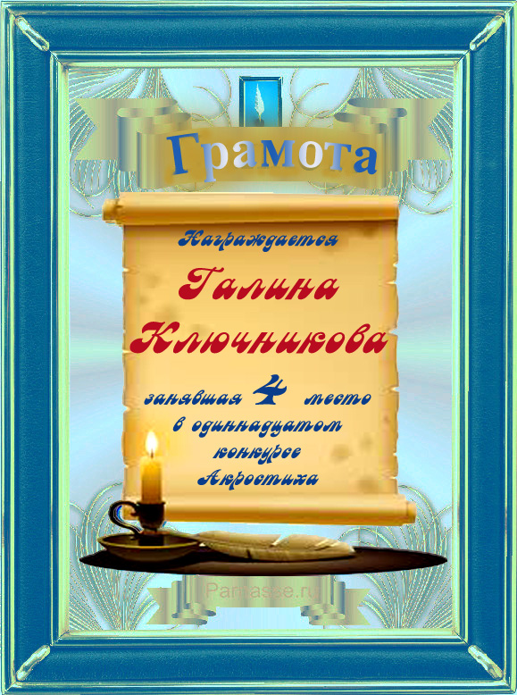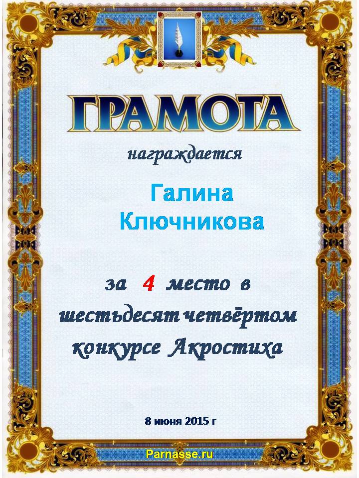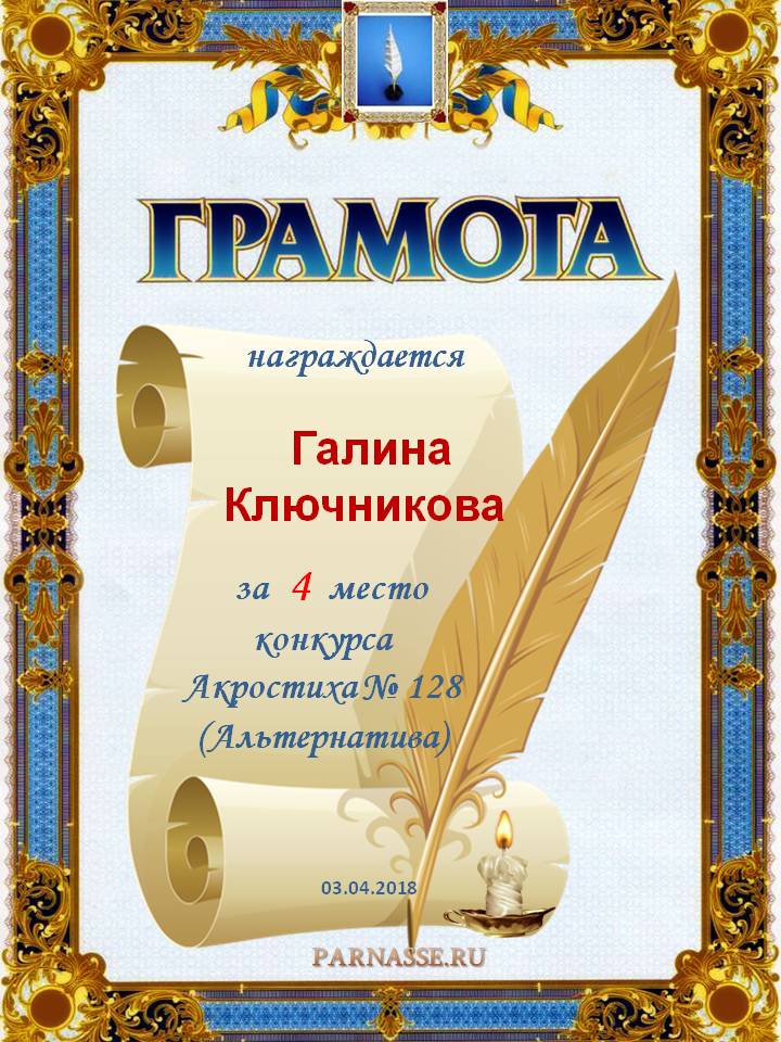 Грамота за 4 место в 97 конкурсе АКРОСТИХА (Альтернатива)! ПОЗДРАВЛЯЮ!