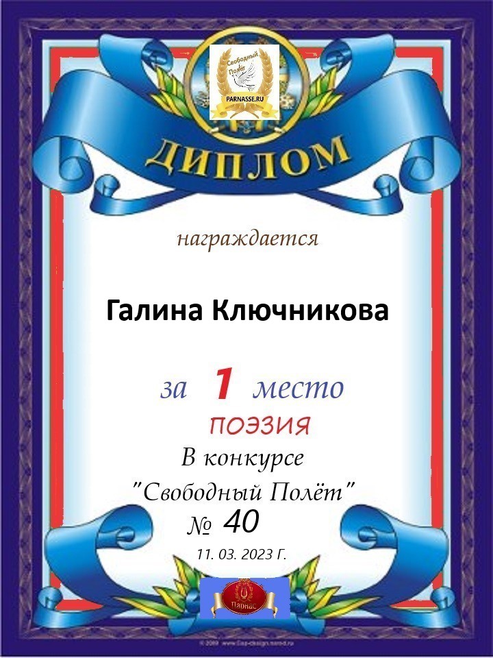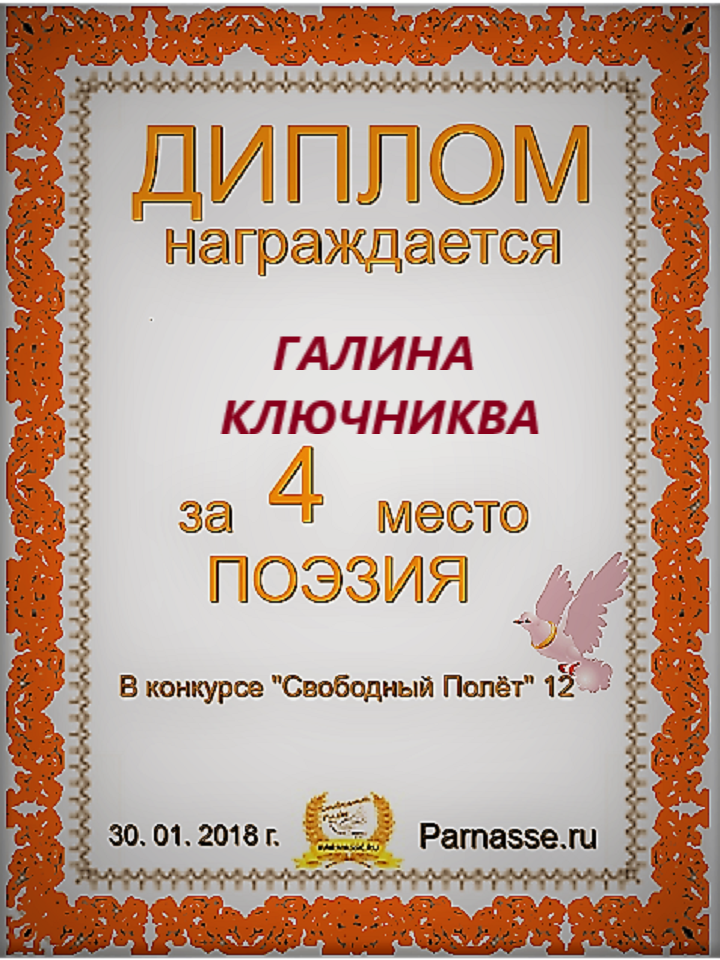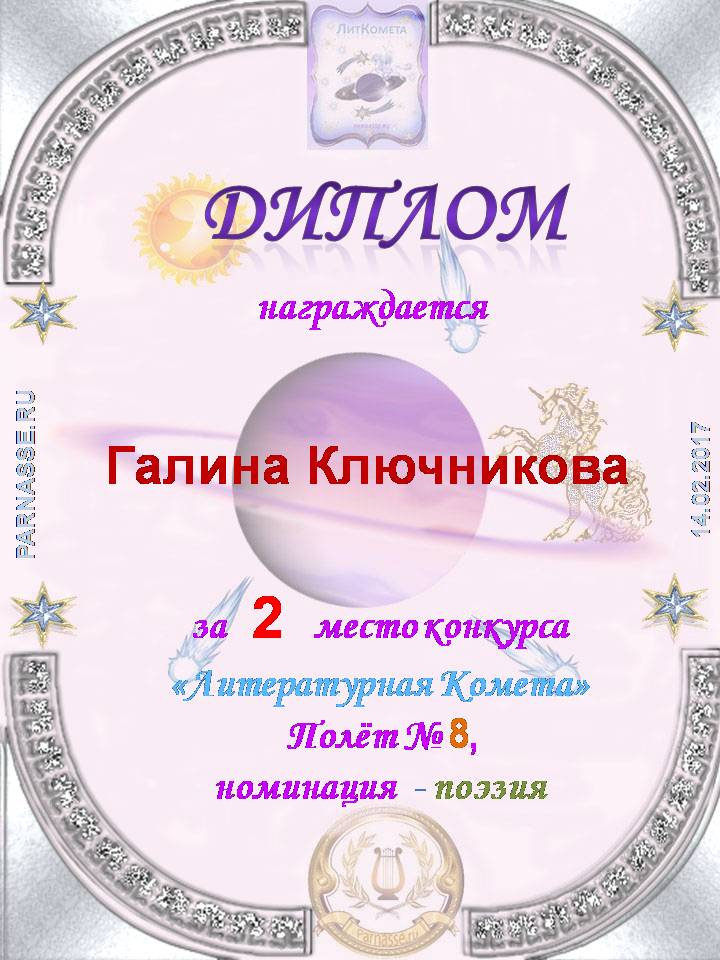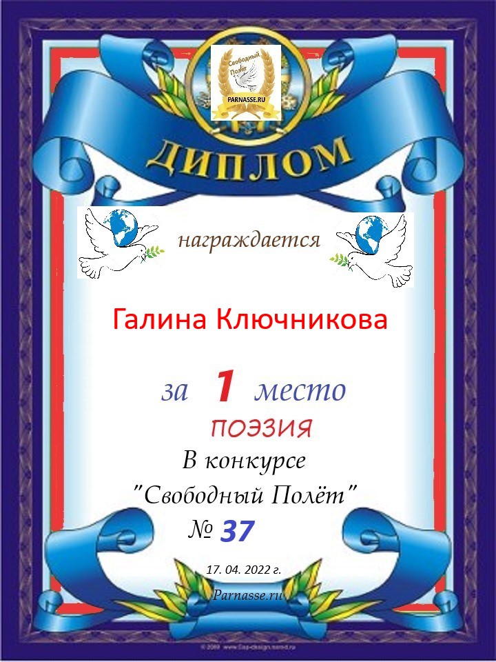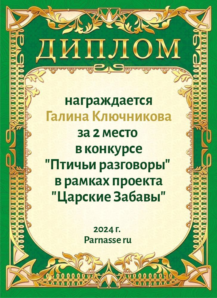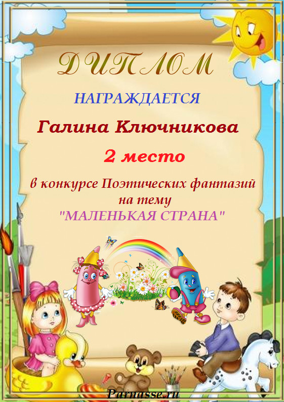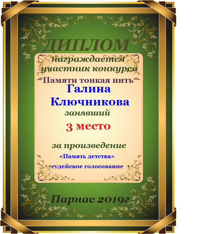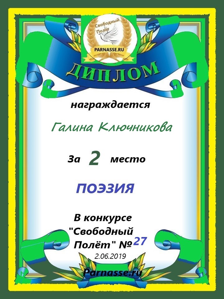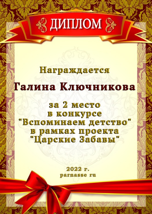 Диплом за 2 место в конкурсе авторского стиха №2 под названием "У каждого есть в жизни Берег Детства".ПОЗДРАВЛЯЕМ!