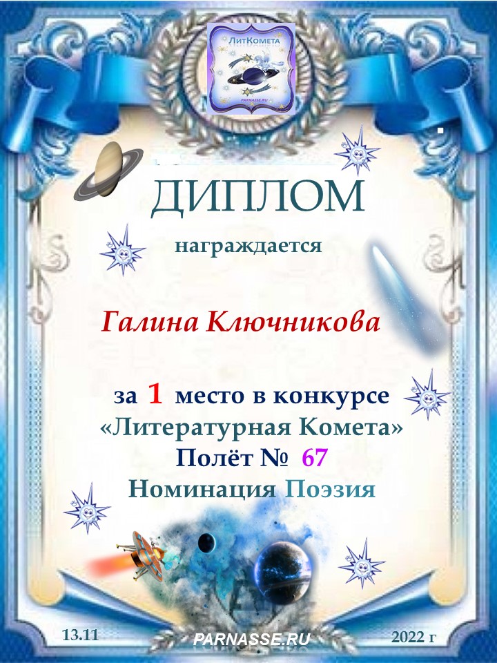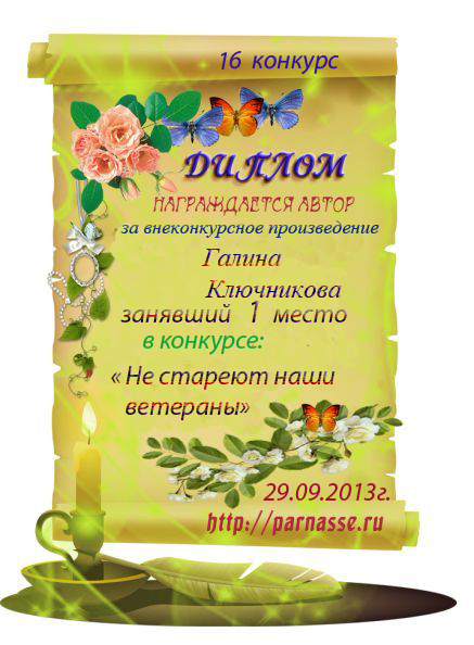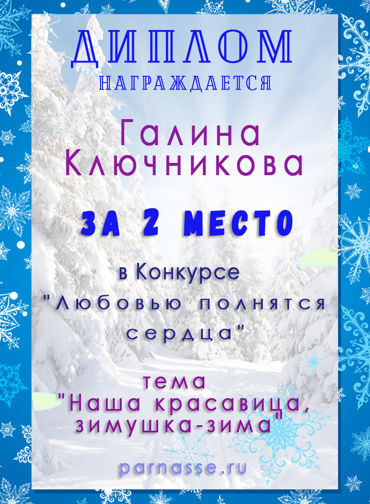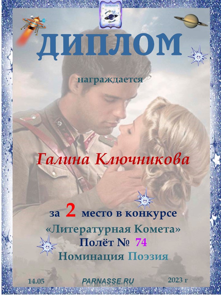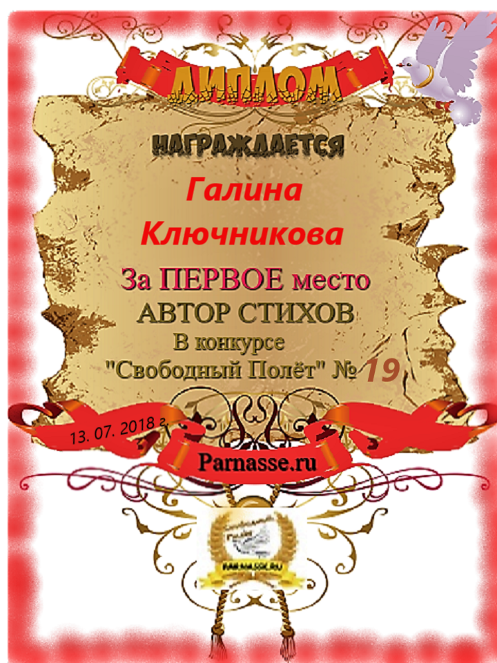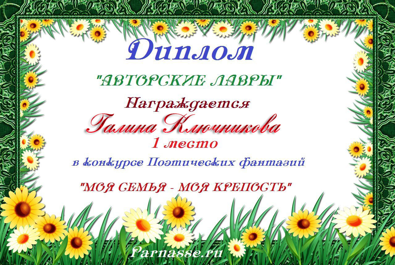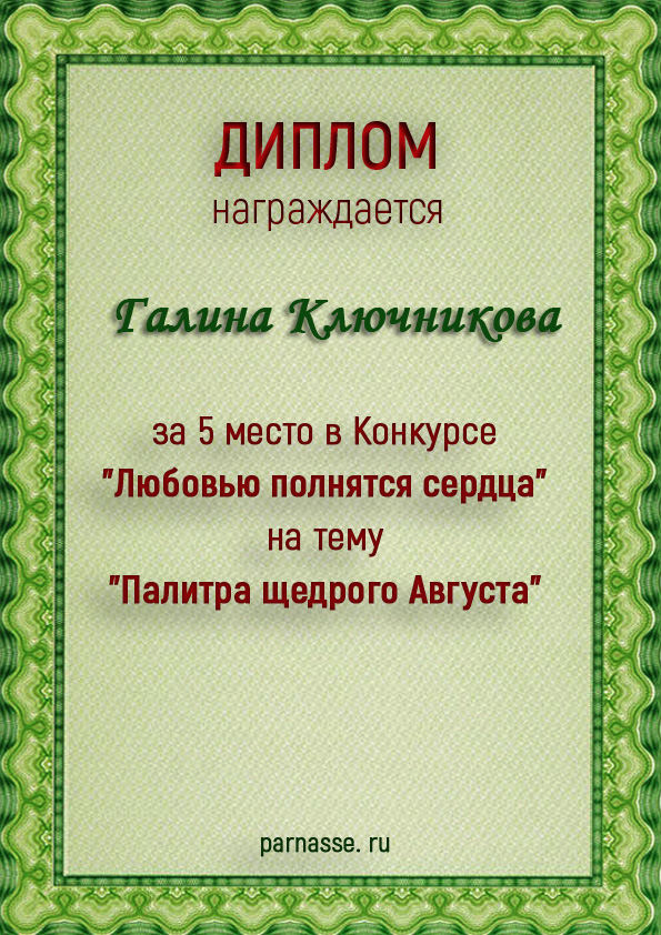 Диплом за 2 место в конкурсе авторского стиха №2 под названием "У каждого есть в жизни Берег Детства".ПОЗДРАВЛЯЕМ!