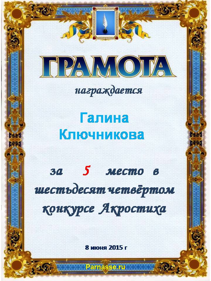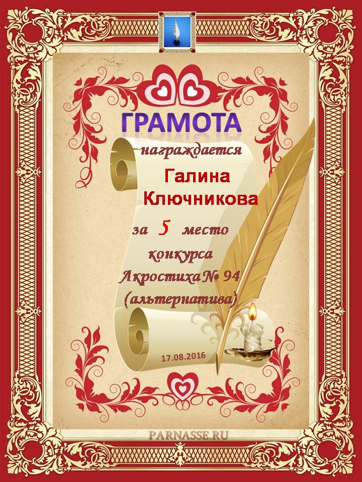 Грамота за 5 место в 94 конкурсе Акростиха (Альтернатива). ПОЗДРАВЛЯЮ!