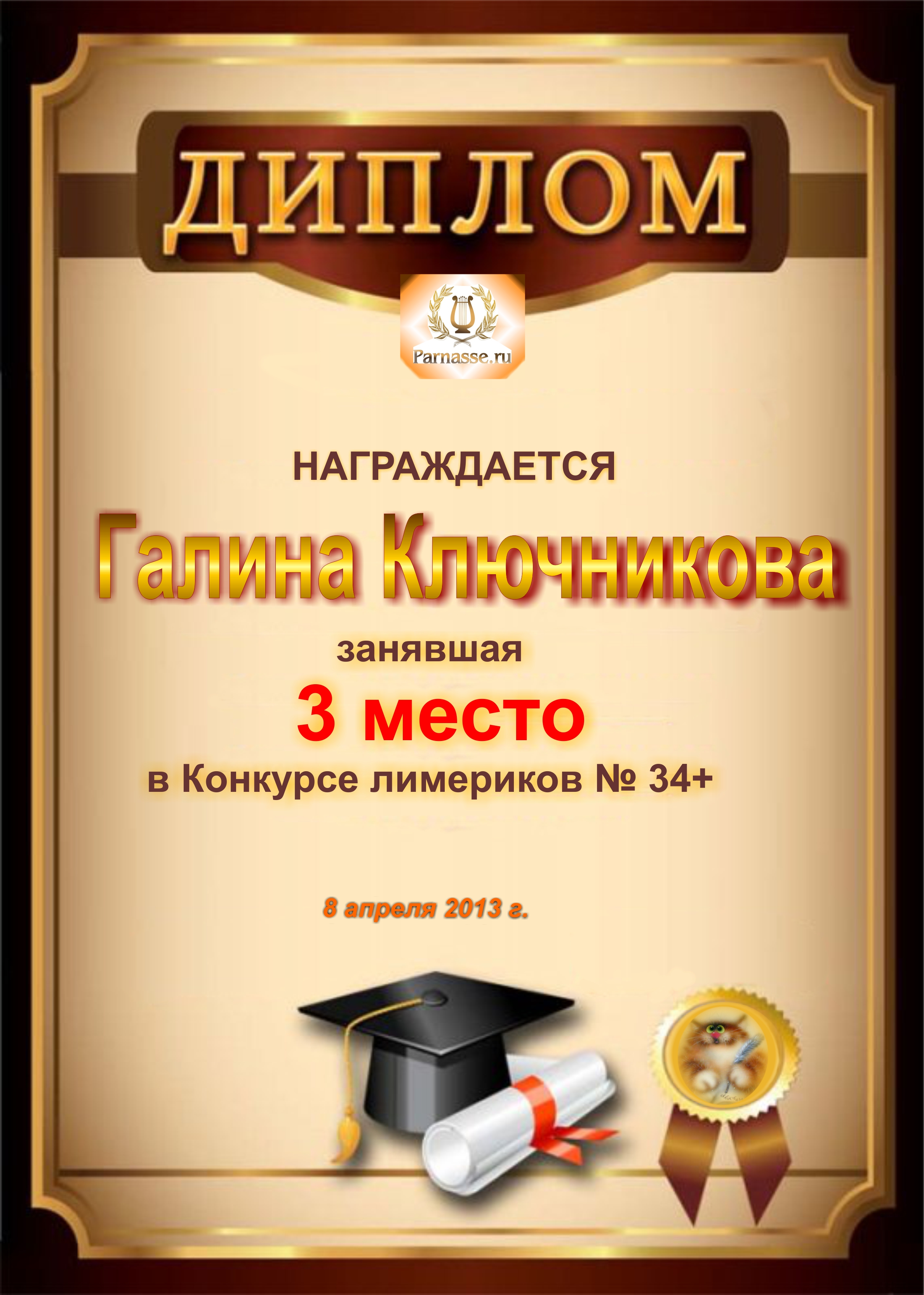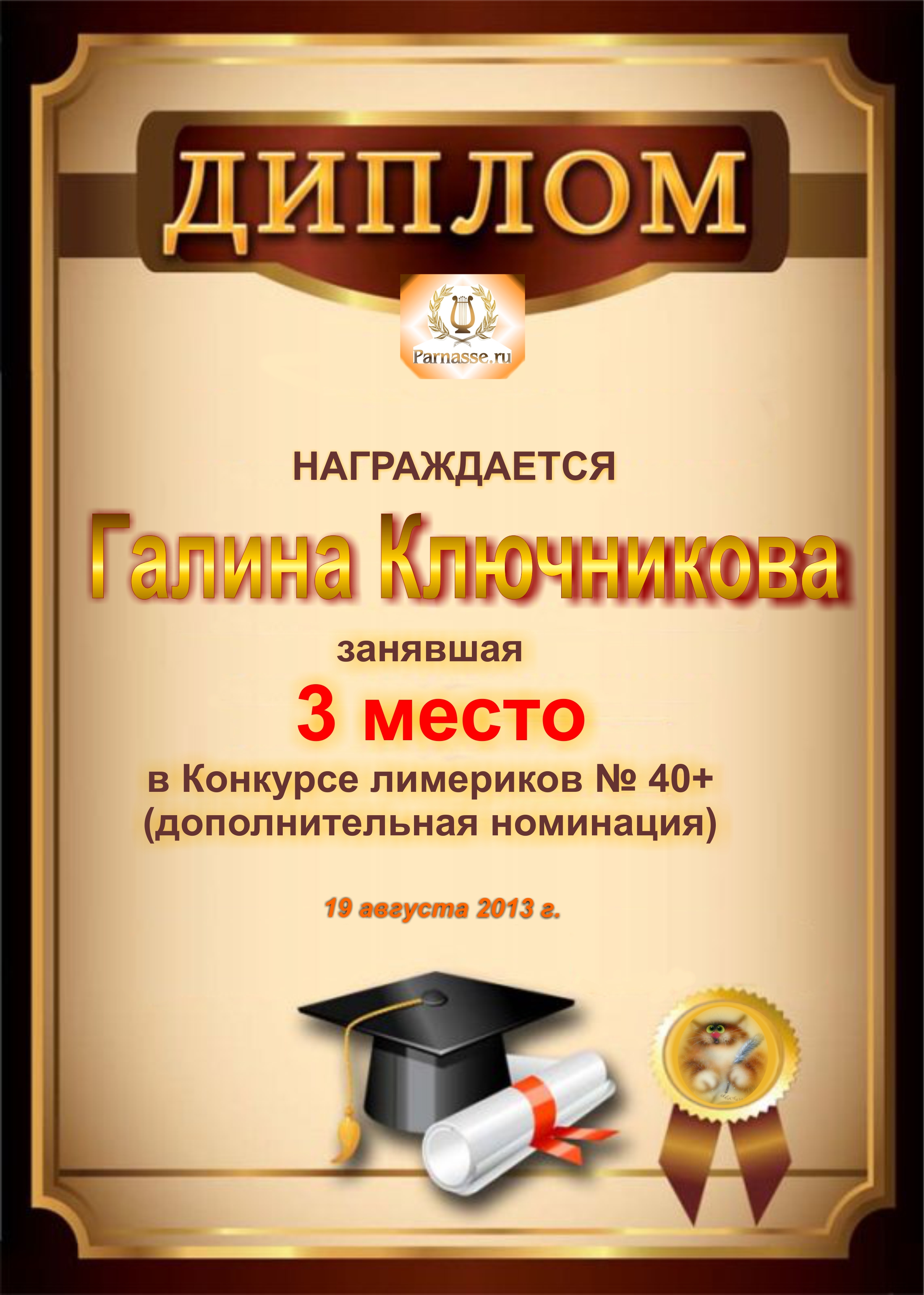 Диплом за победу и 3 место в дополнительной номинации конкурса лимериков № 40+ (19.08.2013 г.)