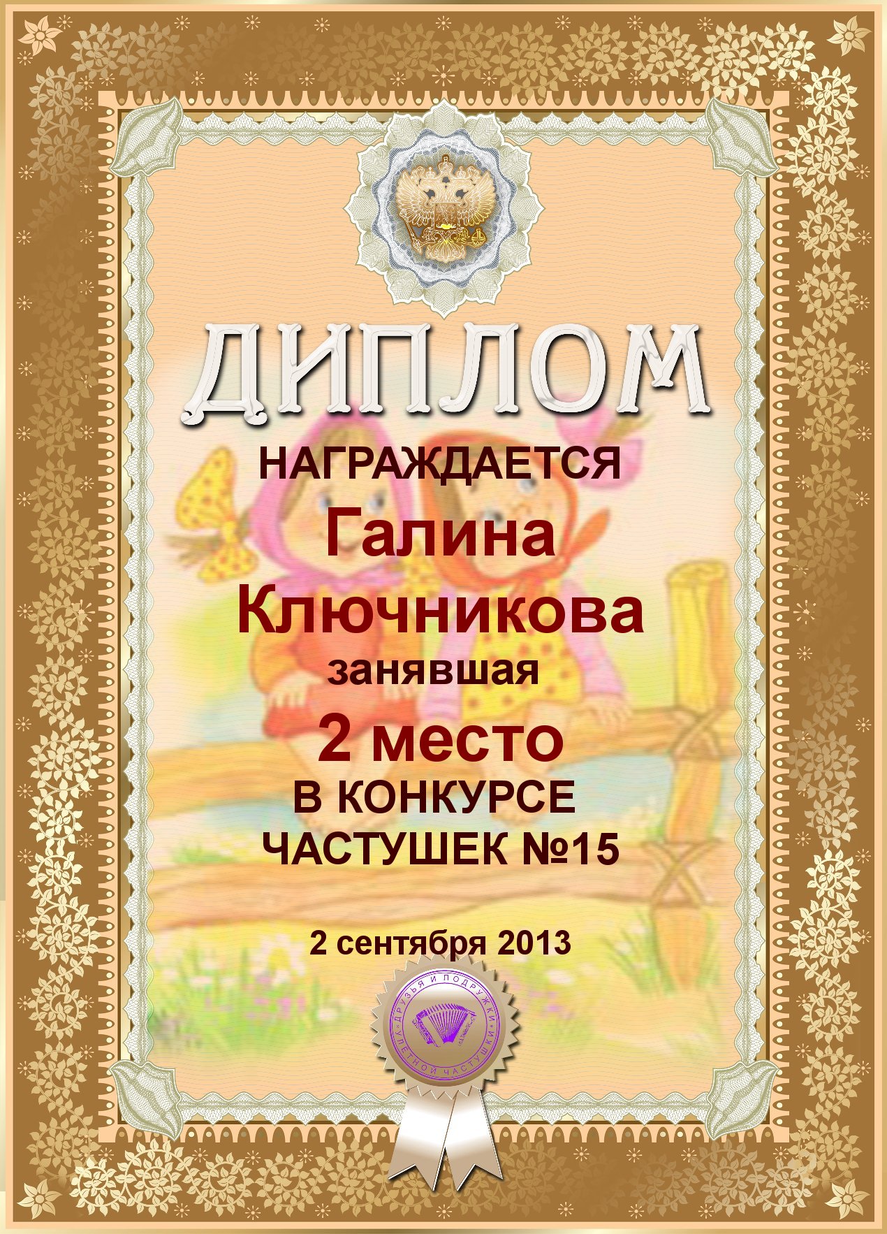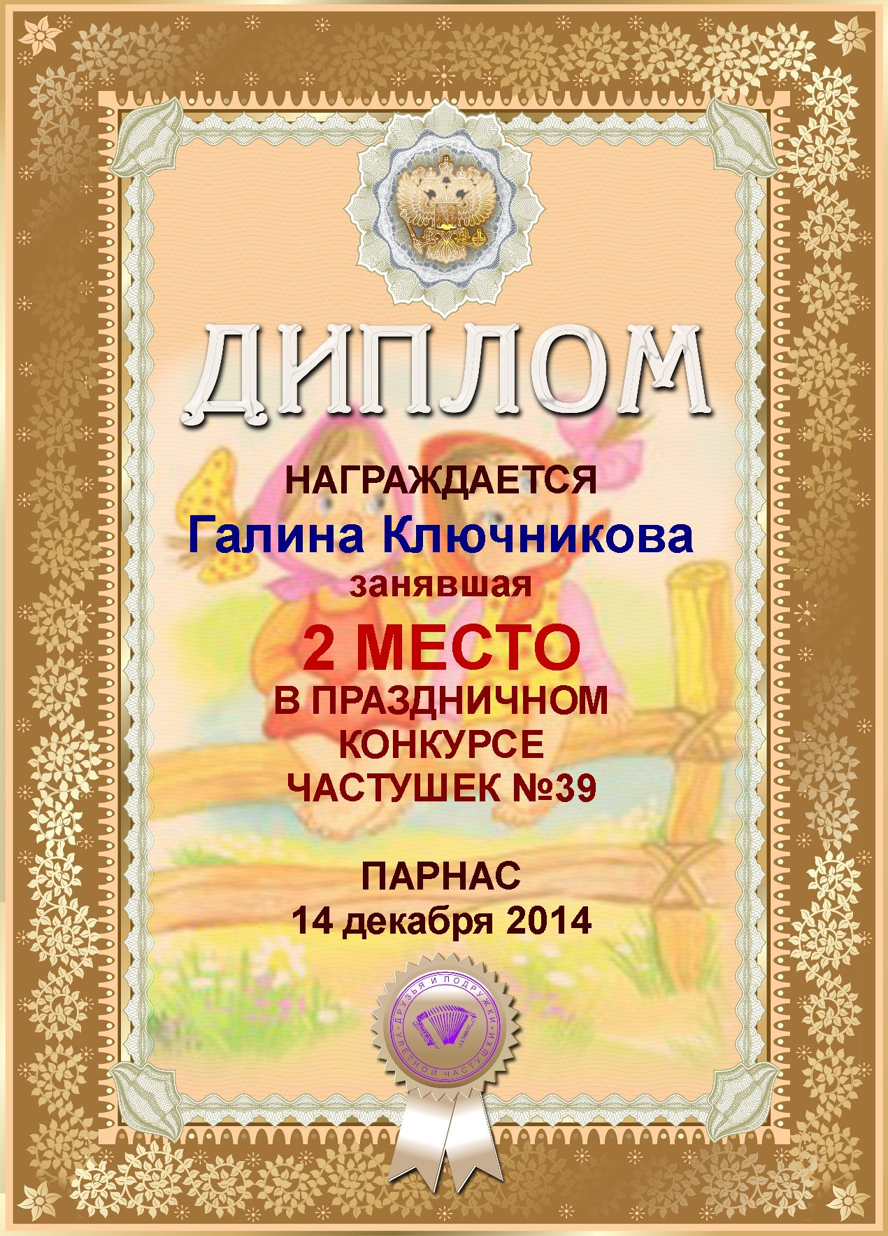 Диплом за 2 место в конкурсе частушки № 6++