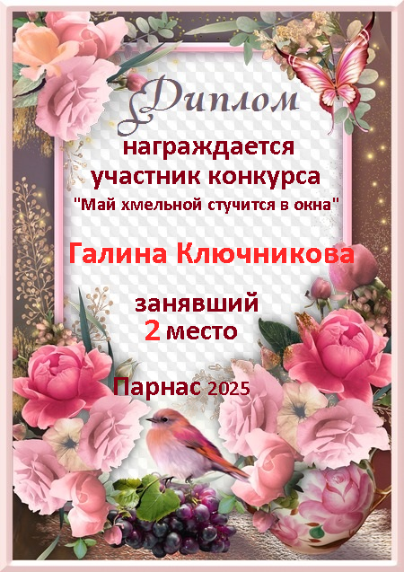 2 место место в судейском голосовании по итогам конкурса "Май хмельной стучится в окна"