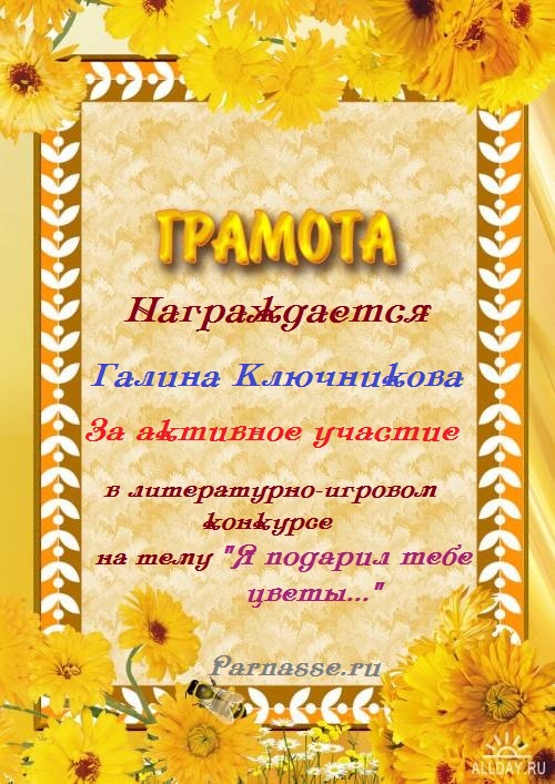 Грамота за активное участие в литературно-игровом конкурсе "Я подарю тебе цветы..."