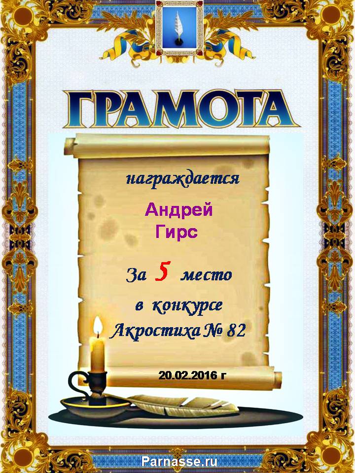 Грамота за 5 место в 82 конкурсе АКРОСТИХА!