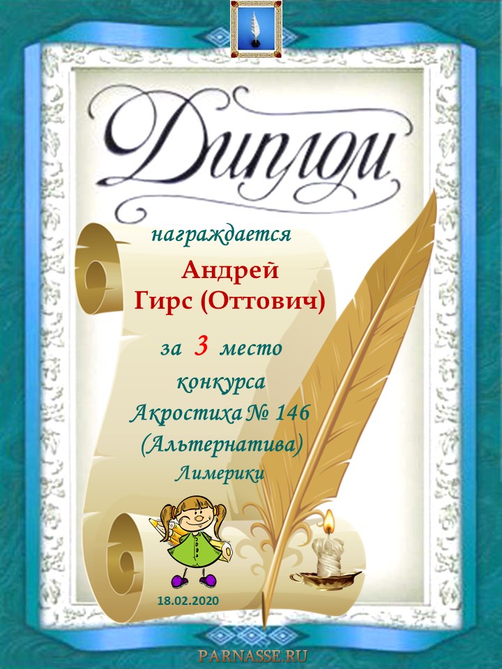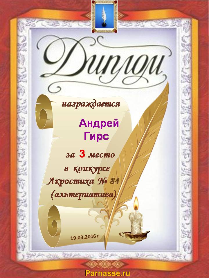 Диплом за 3 место в 84 конкурсе АКРОСТИХА (Альтернатива)!