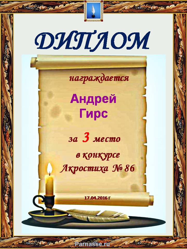 Диплом за 3 место в 86 конкурсе АКРОСТИХА!