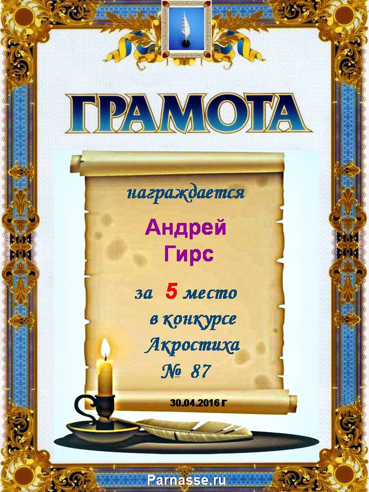 Грамота за 5 место в 87 конкурсе АКРОСТИХА!