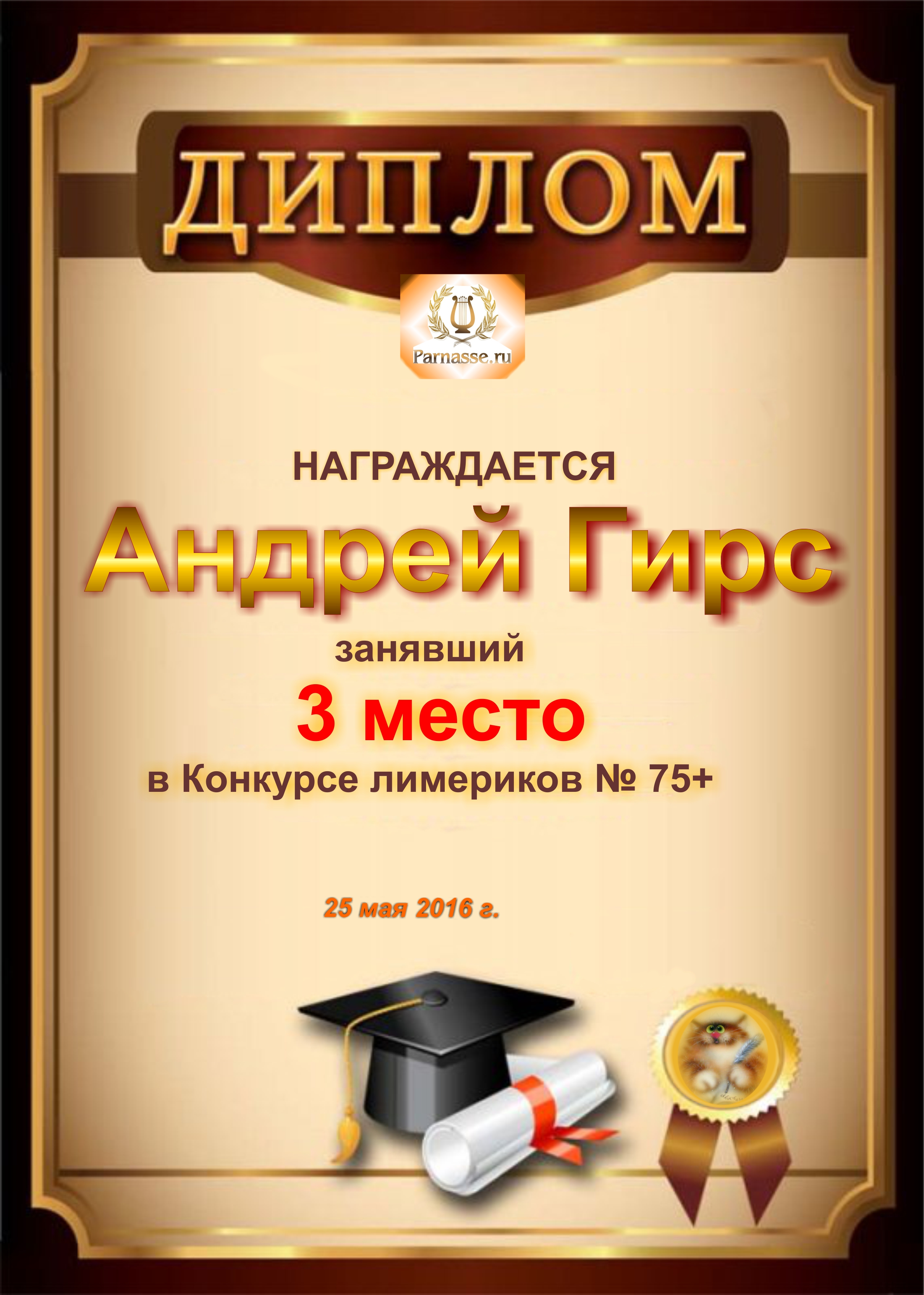 Диплом за победу и 3 место в конкурсе лимериков 75+ (25.05.2016 г.)