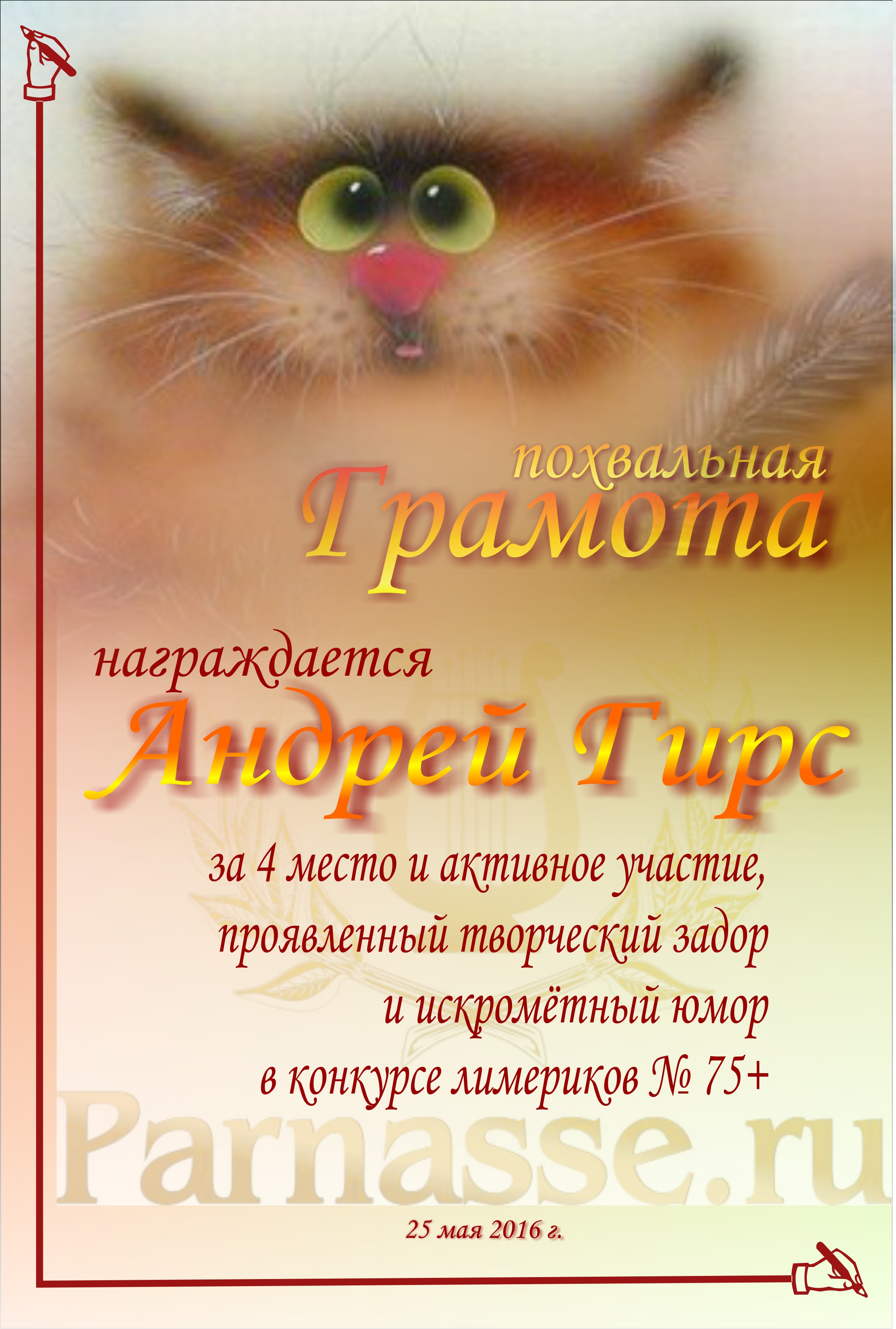 Похвальная грамота за 4 место и активное участие в конкурсе лимериков № 75+ (25.05.2016 г.)