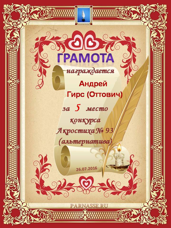 Грамота за 5 место в 93 конкурсе Акростиха. (Альтернатива)