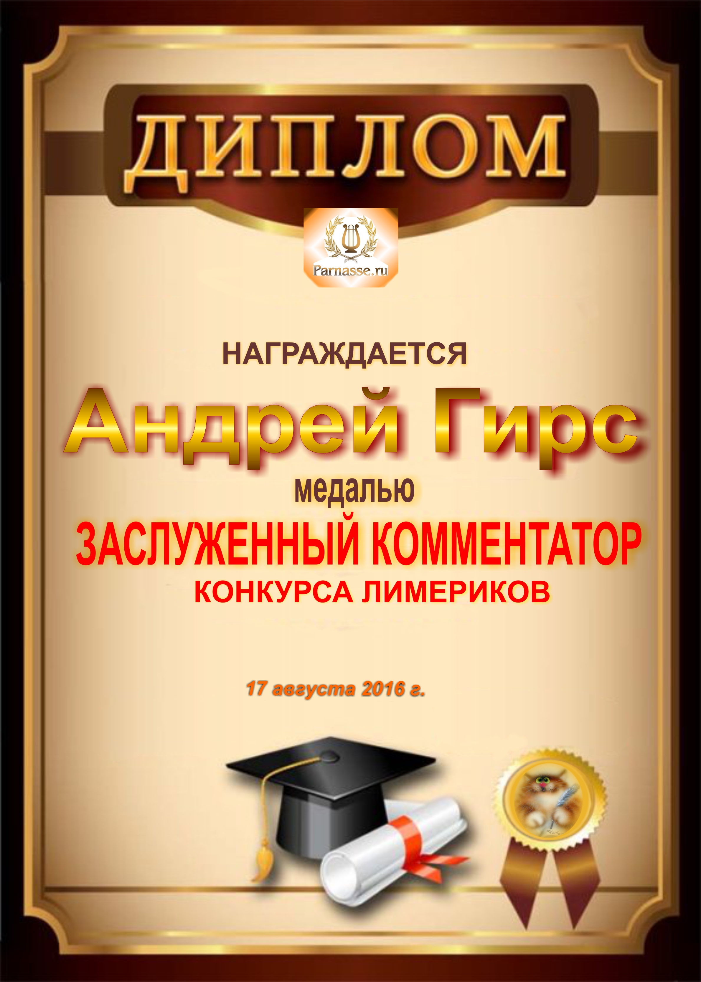 Диплом "Заслуженный комментатор конкурса лимериков" (17.08.2016 г.)