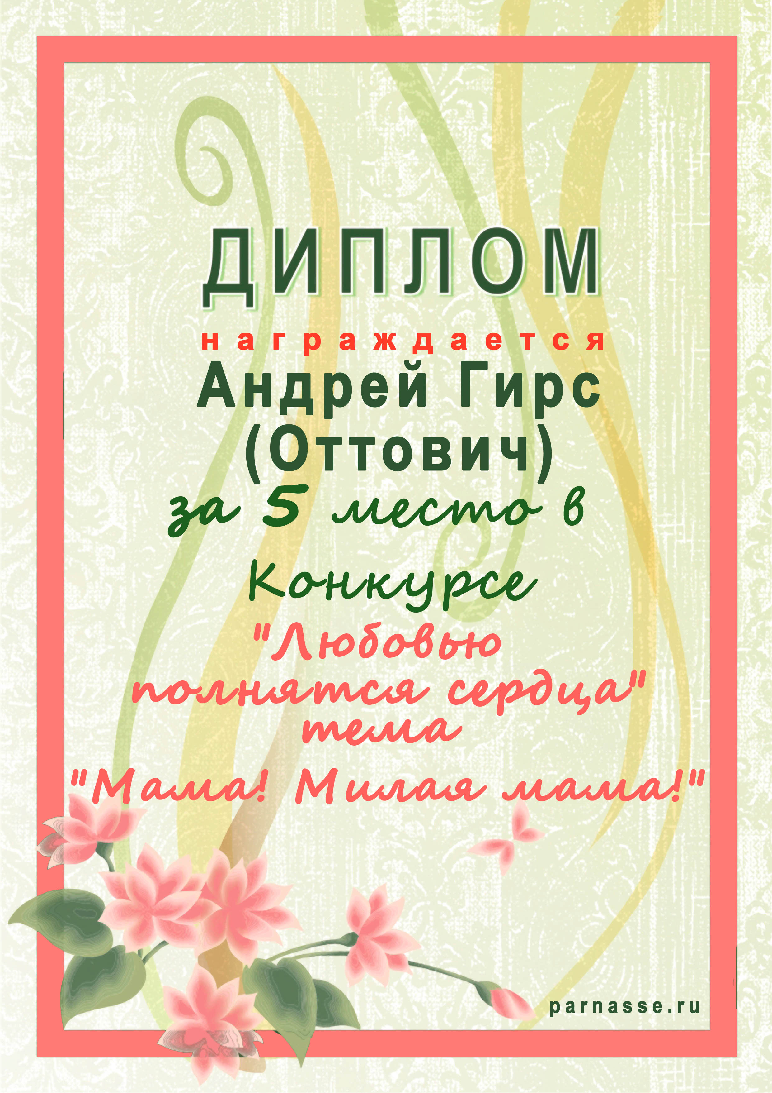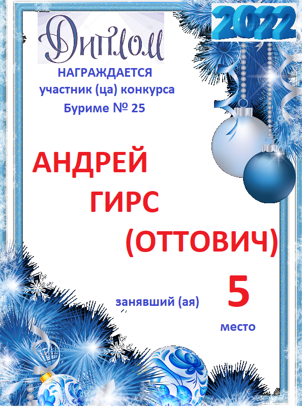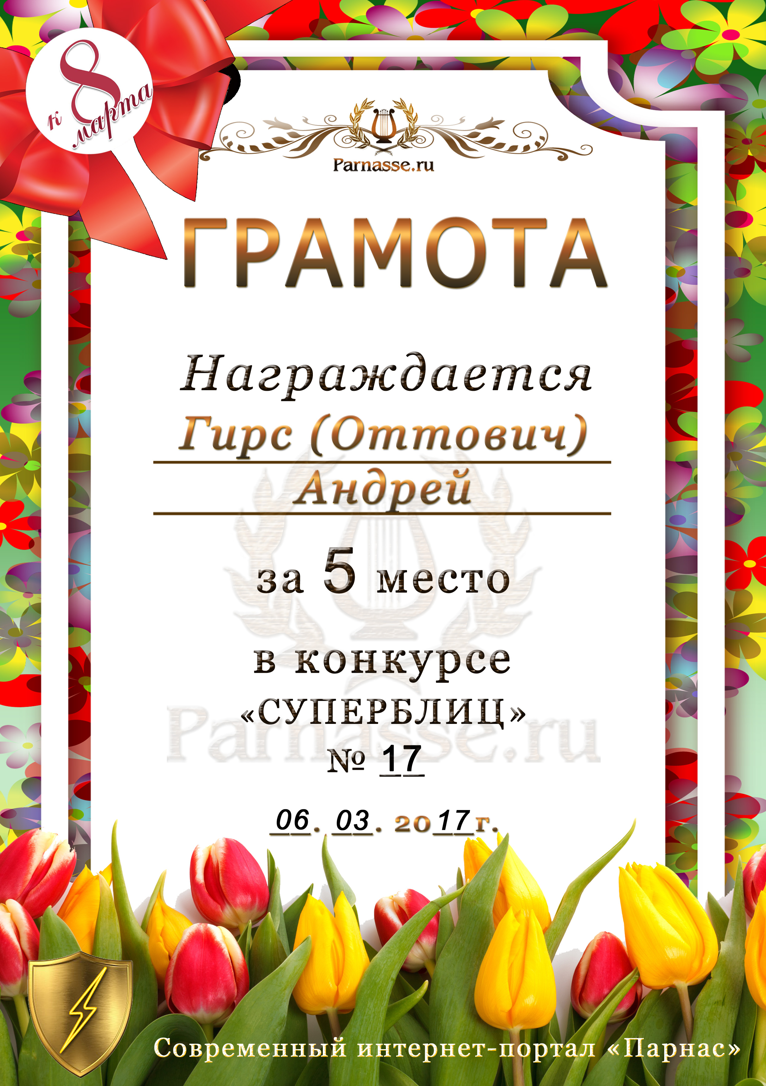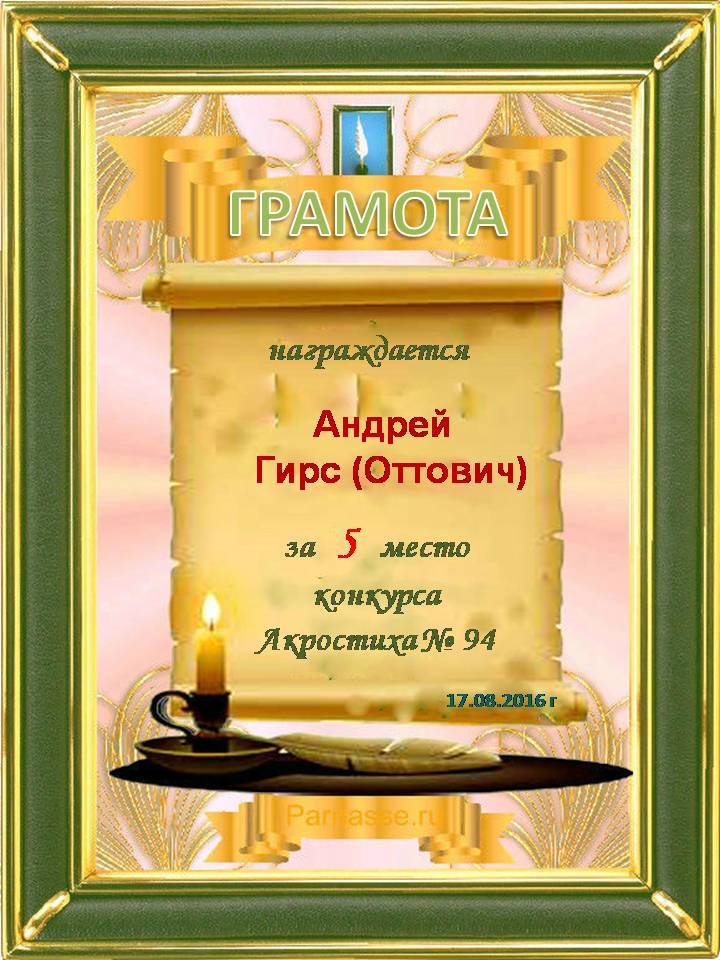 Грамота за 5 место в 94 конкурсе Акростиха.