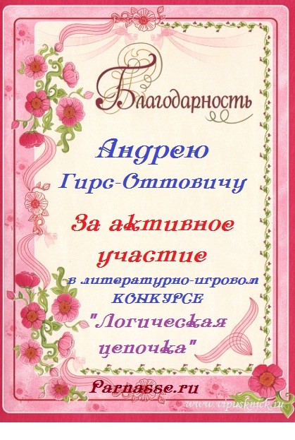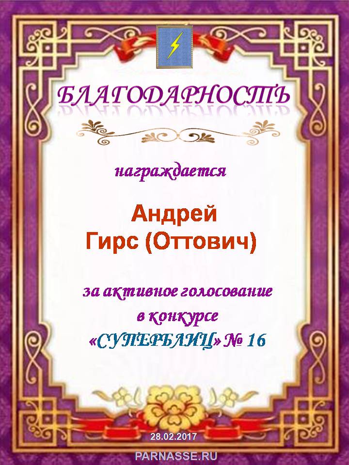 Похвальная грамота за активное участие в конкурсе лимериков № 76+ (17.08.2016 г.)